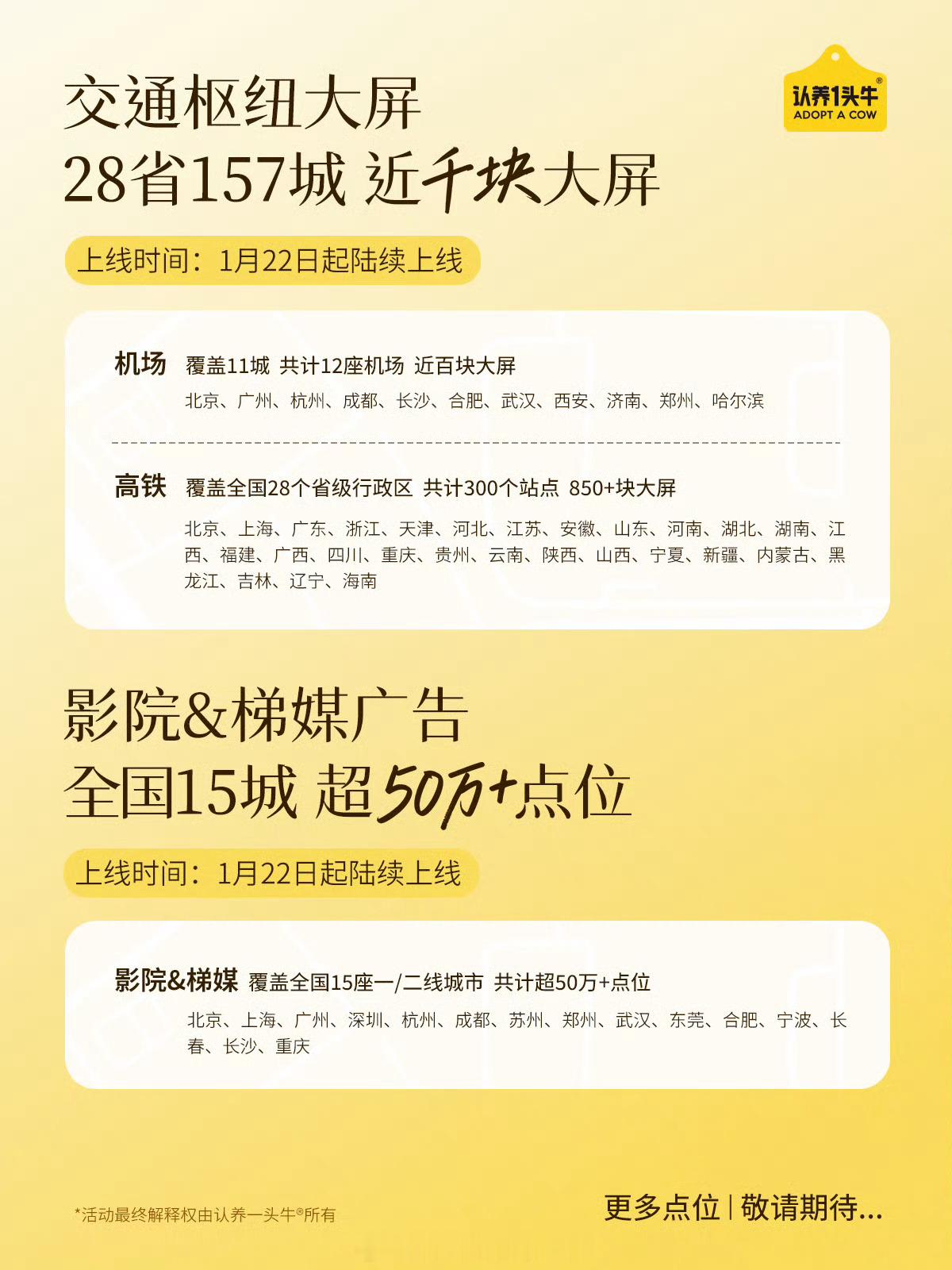 赵丽颖认养一头牛还有两天官宣,线下地广已经全部准备好,10城户外地产巨屏!18城30屏!28省158城机场高铁屏!全国影院电梯50万+点位!全部在官宣日同步上线!给双料视后赵丽颖的排面拉满了