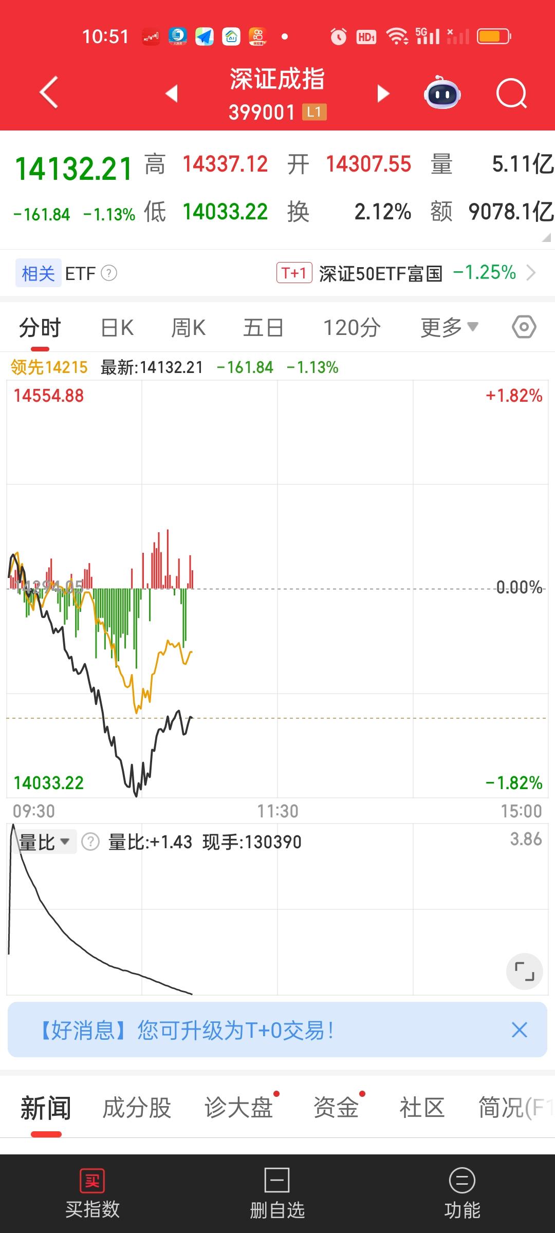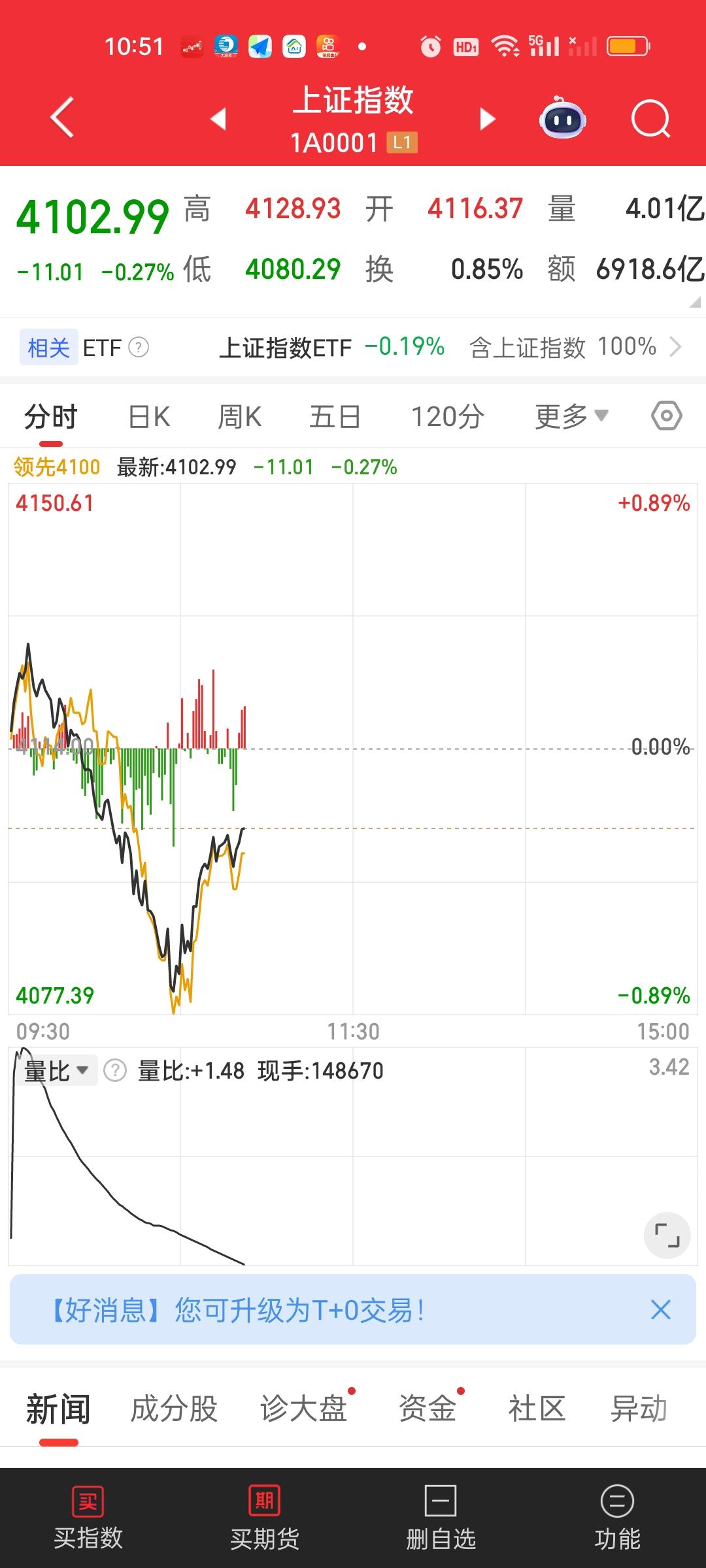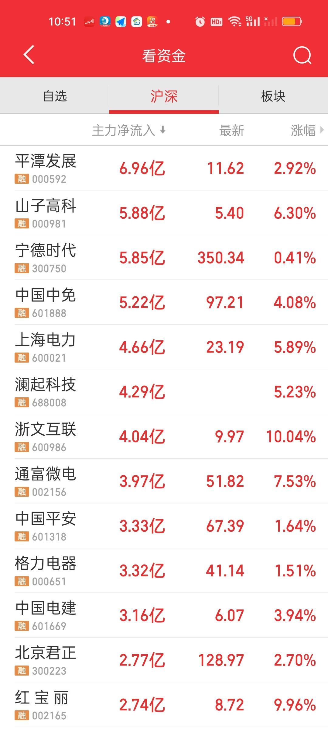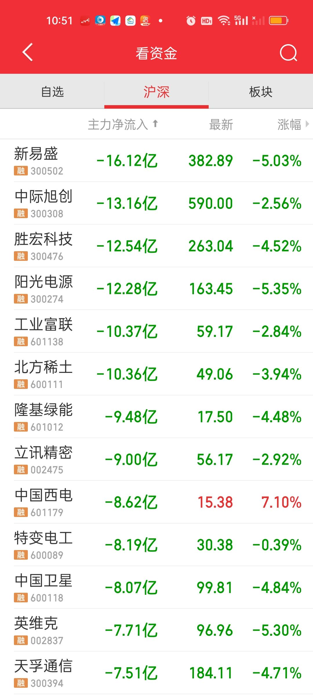 今天这个50个点的急速下杀是带量的。因为早上是缩量五六百亿的,杀完以后放量了900亿,这就说明在下杀的过程中量能放出来了。最低点来到4080.29,但肯定不是这次的底,前面我们多次说过4030这个位置要到以下,现在还有50个点。今天杀不到位,后面就还得继续杀。 大盘资金净流出接近1000亿,主力资金净流入超10亿的个股还没有,净流出超10亿的已经有6只了,预计下午收盘还会大幅增加。CPO板块的几个核心股被杀的不要不要的。但依旧没到位置呀。