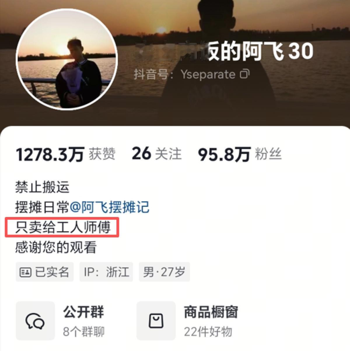 在此前的视频里,阿飞曾将摆摊地点写在个人简介里,并称周一到周五主要卖给工人师傅,周六周日接受网友来吃。现在简介里已经没有摆摊信息,仅强调“只卖给工人师傅”。