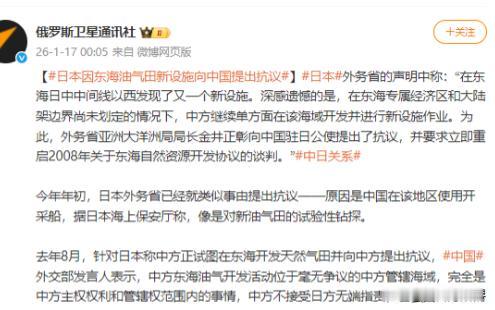 外媒1月18日报道:“中日关系持续紧张,日本外交部发布消息称,在东海日本—中国中间线中国一侧发现中国新建一座构造物,可能用于资源开发,为此向中国驻日本大使馆提出强烈抗议,称‘绝不允许单方面开发行为’。” 所谓的“中日东海中间线”,从头到尾都是日本自己说了算的东西,没有任何国际法依据,中国从来就没承认过。 在东海划界这件事上,国际社会有公认的原则,也就是大陆架自然延伸原则,《联合国海洋法公约》里写得很清楚,沿海国的大陆架可以延伸到陆地自然延伸的尽头。东海大陆架本来就是中国大陆在水下的自然延伸,一直到冲绳海槽才算真正终结,这个海槽深度快到3000米,完全符合切断大陆架的标准。 所以按照这个原则,中方主张以冲绳海槽为界划分专属经济区,是有充分科学和法律依据的,之前中国提交给联合国的东海划界案,也详细说明了这些依据。 日本非要提“中间线”,本质上是想靠这种单方面主张多占海域资源。可问题是,就算按它自己的逻辑,这次发现构造物的地方也在它画的线的中国一侧,根本没越界。 中国在自己管辖的海域内建构造物,不管是用于资源开发还是其他合理用途,都是在行使主权范围内的权利,合法又正当,和日本没有任何关系。 之前中日在2008年就东海问题达成过原则共识,也只说在有争议的海域可以谈共同开发,而中方一侧的海域根本不存在争议,自然不需要和日本商量,更谈不上“单方面开发”。 日本之所以每次都跳得这么高,核心还是资源焦虑在作祟。日本本土资源极度匮乏,石油、天然气、稀土这些战略物资几乎全靠进口,一旦外部供应出问题,整个国家的运转都会受影响。 这些年中国对稀土出口的管控,更让日本深感掣肘,所以它一直把东海的资源当成摆脱依赖的希望。 之前就炒作过中方油气田有“吸管效应”,担心吸走它所谓的“资源”,这次看到中方建构造物,又怕中国抢先开发海底资源,断了它的念想。这种焦虑还延伸到了深海,日本近些年在南鸟岛附近搞深海稀土泥开发,却又担心中国海军的活动会影响它的计划,本质上就是既想要资源又没能力守住的心态。 更值得琢磨的是,日本的抗议不只是资源问题,还藏着战略层面的算计。这些年日本一直在加速“再军事化”,防卫预算连续创纪录,2025年都到11万亿日元了,还在买F-35战机,把直升机航母改成准航母。 它之所以敢在东海频繁挑事,背后离不开美国的撑腰。就在这次抗议前后,美军军舰还过航台海,明显是在给日本站台。日本就是想借着美国的势力,在东海扩大自己的影响力,把单方面的“中间线”变成既成事实,同时转移国内矛盾,迎合右翼势力的需求。 可日本似乎忘了实力对比已经变了。这些年中国海军在东海常态化巡航,海警船也保持着存在,实力早就不是日本能轻易撼动的。 连对中国实力最了解的美军,在打交道时都保持克制,关键时刻会主动沟通,生怕擦枪走火。 但日本的一些政客却看不清现实,总想着靠外部势力撑腰来占便宜,动辄就抗议、叫嚣,完全没意识到自己的主张根本站不住脚。 其实日本自己也清楚,这种抗议没什么实际效果。这些年它针对东海的中国活动提过无数次抗议,从海警船巡航到渔船作业,再到资源勘探,可中方从来没因为这些抗议就停下合法活动。毕竟在自己的海域里做事,于法于理都站得住脚,根本没必要理会这种无理指责。 日本要是真的想解决东海问题,靠抗议和炒作根本没用。正确的做法应该是正视国际法原则,承认中方在自己管辖海域的合法权利,坐下来在有争议的区域好好谈。可现在它一门心思跟着美国搞对抗,还不断强化军力,只会让中日关系更紧张。 这种既不符合国际法,又违背地区和平利益的做法,最终只会让自己陷入被动。毕竟实力摆在这,东海的局势从来不是靠谁的抗议声大来决定的,而是看谁站在理上,谁有守护自己权益的实力。