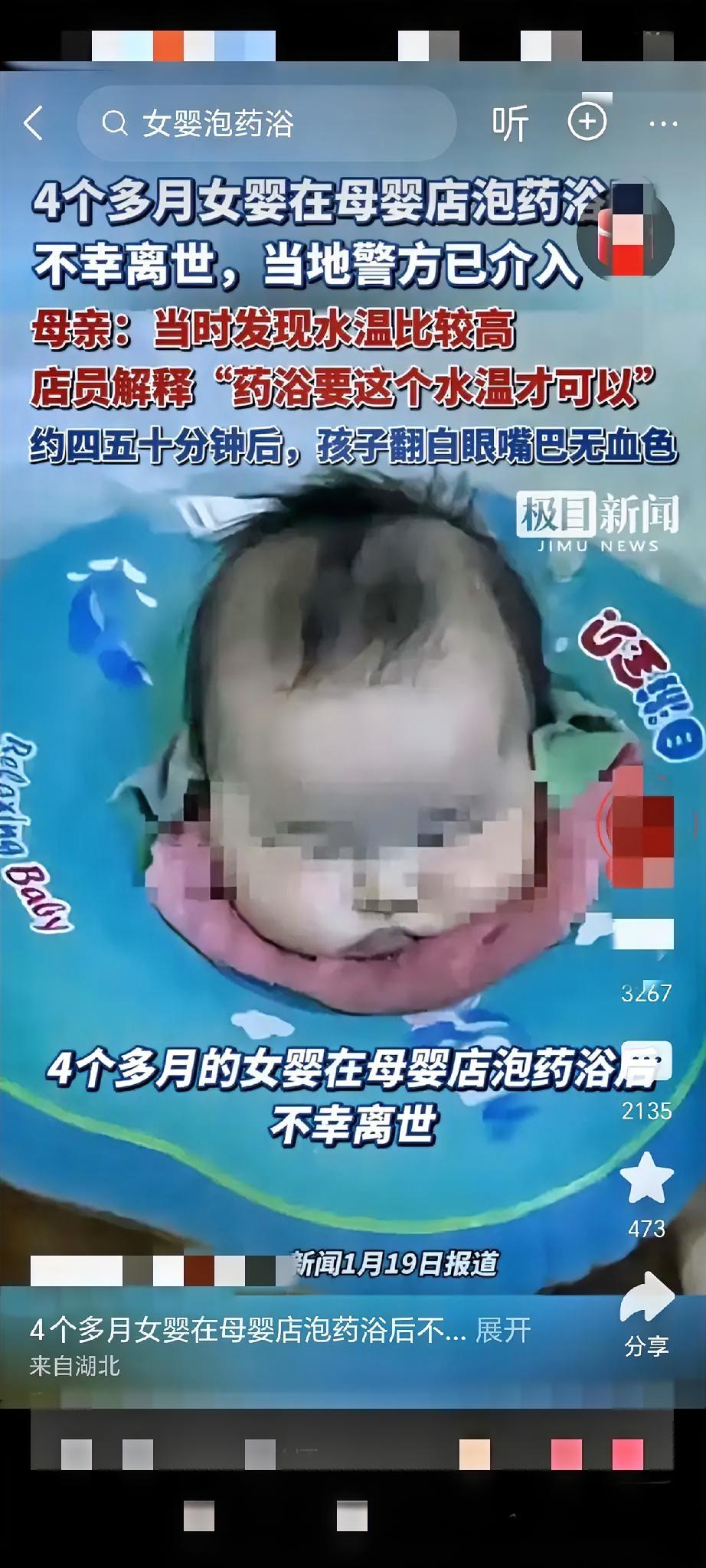 太痛心了,安全警钟长鸣! 四个月婴儿药浴事故引人深思 最近,一起令人痛心的事件引发了广泛关注:一名4个多月大的女婴在母婴店泡药浴后不幸离世。据母亲回忆,当时水温比较高,大约四五十度,这可能是悲剧发生的关键因素。婴儿的皮肤娇嫩,对温度的耐受性极低,稍有不慎就可能造成严重伤害。 这起事件让我忍不住想问:母婴店的药浴服务真的安全吗?相关监管是否到位?数据显示,近年来婴幼儿在类似服务中受伤的案例不在少数,但很多家长仍然对这些潜在风险缺乏足够的重视。 药浴本身是一种传统疗法,旨在通过草药浸泡来促进婴儿健康,但如果操作不当,就会变成夺命陷阱。母婴店的工作人员必须经过严格培训,确保每一个环节都符合安全标准。同时,家长也要提高警惕,不能盲目信任商家的宣传。 大家觉得,我们该如何避免类似的悲剧再次发生呢?欢迎在评论区留言,一起探讨如何守护宝宝的安全!