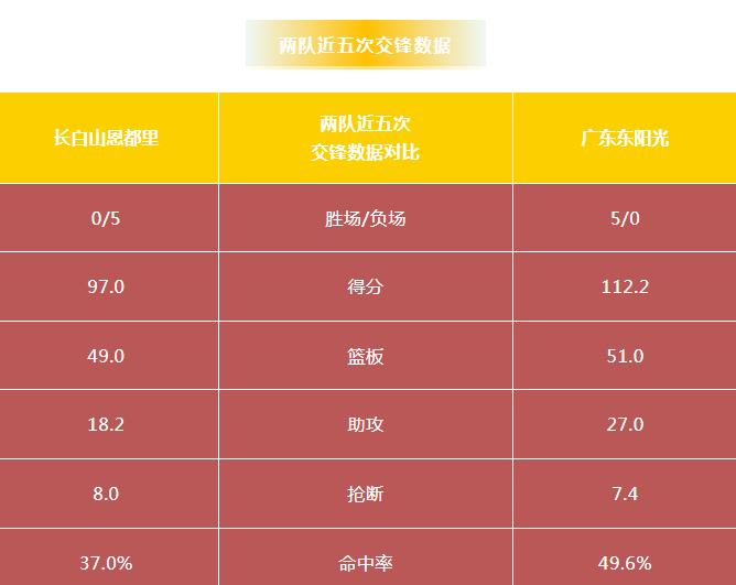 长白山恩都里与广东东阳光历史上一共交手64次,长白山恩都里10胜54负。
