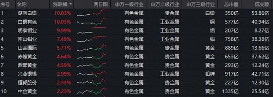 成份股方面,湖南白银、白银有色、明泰铝业3股涨停,南山铝业涨逾7%,山金国际涨超5%,赤峰黄金、西部黄金等个股大幅跟涨。