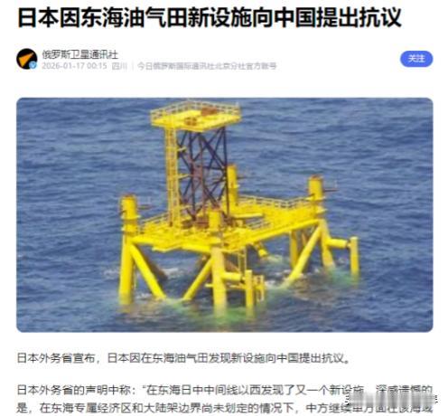 1月16日,日本针对东海油气田开发向中方提出抗议,声称中方在所谓“日中中间线以西