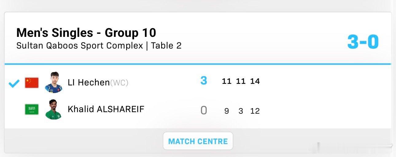 2026wtt马斯喀特挑战赛资格赛小组赛李和宸3-0赫里德韩菲儿3-1肖瑶茜