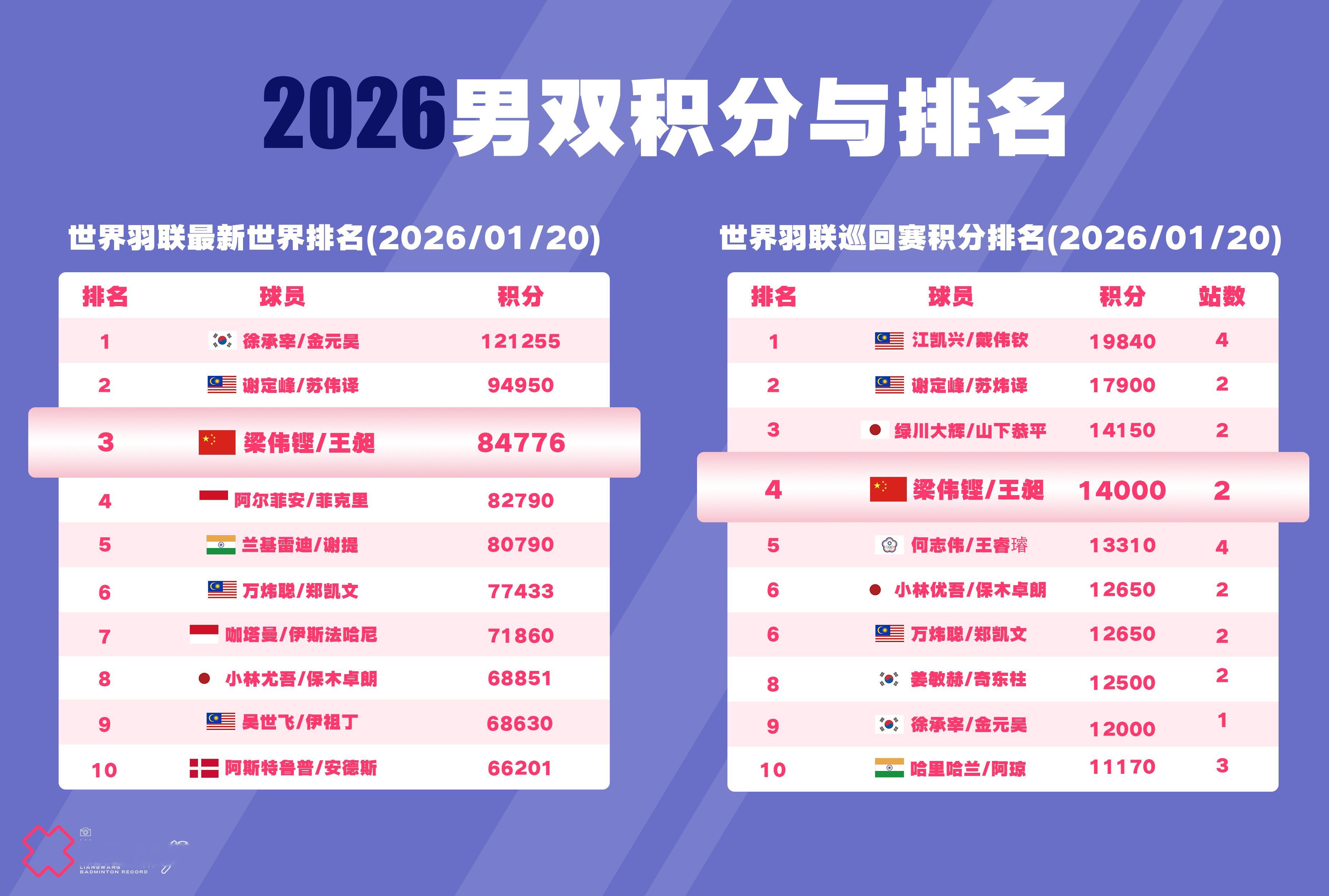 梁王驾到梁王组合 梁王加油 排名及积分更新BWF最新世界排名(2026/01/20)排名:3(⬆️2)积分:84,776BWF巡回赛积分排名(2026/01/20)排名:4(⬆️45)积分:14000