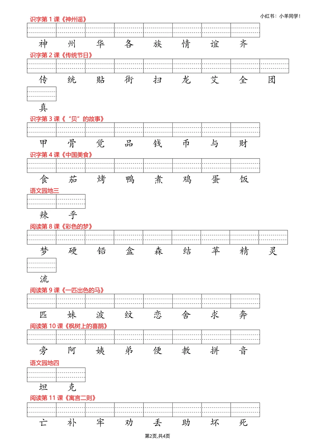 2、写字表—看生字写拼音,4页。