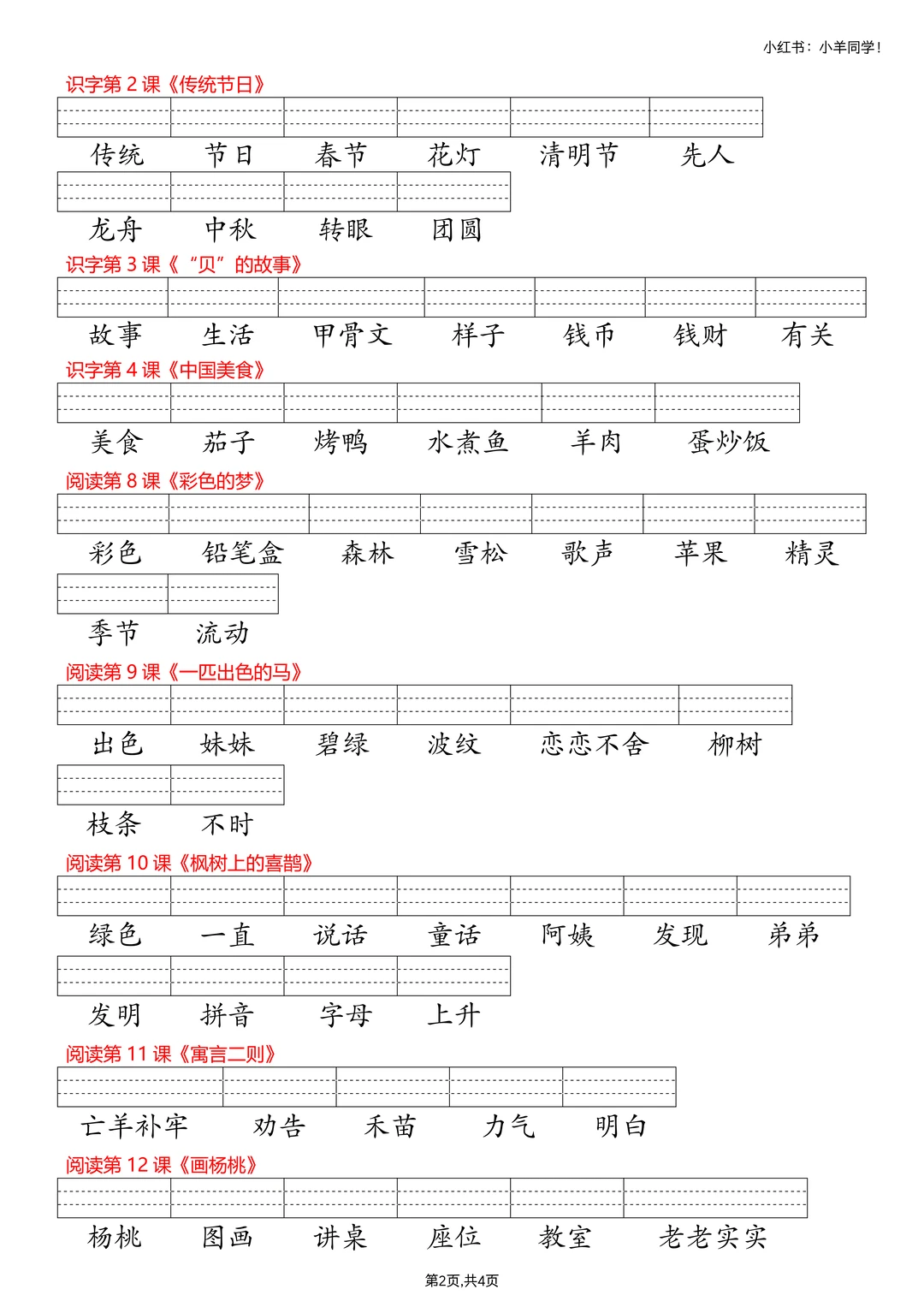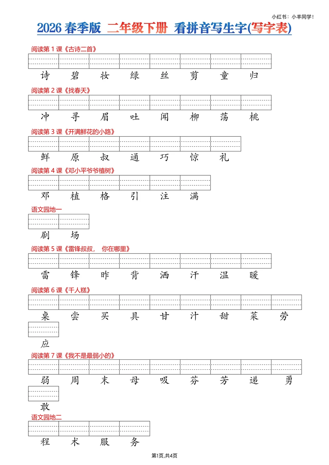 3、词语表—看生字写拼音,4页。