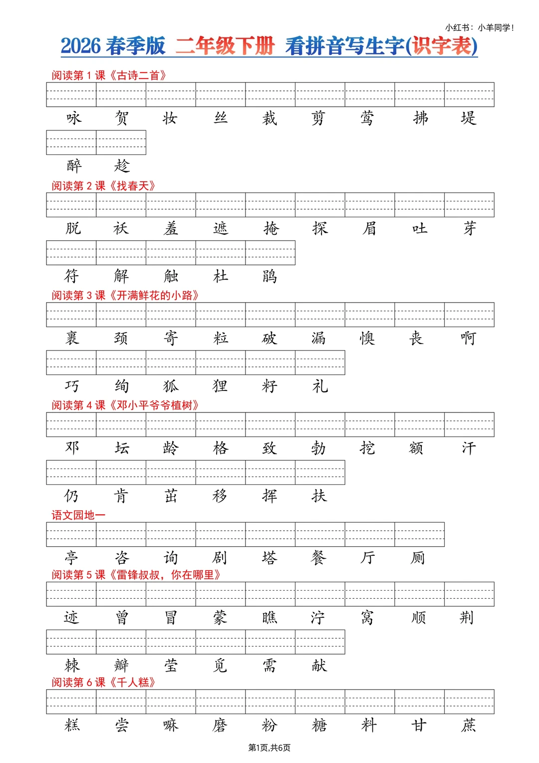 1、识字表—看生字写拼音,6页。