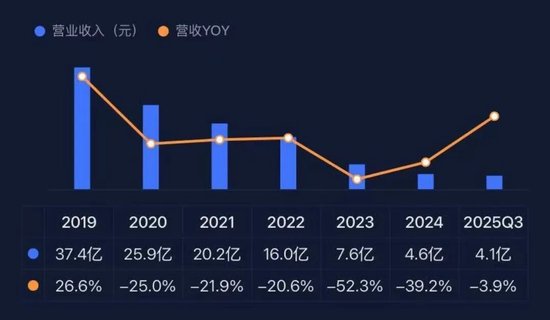 首先是收入的断崖式下跌,从2021年的20.2亿元降至2024年的4.65亿元,易华录的营业收入四年间下降约77%。2025年前三单季度总营收4.1亿,继续下滑3.9%。