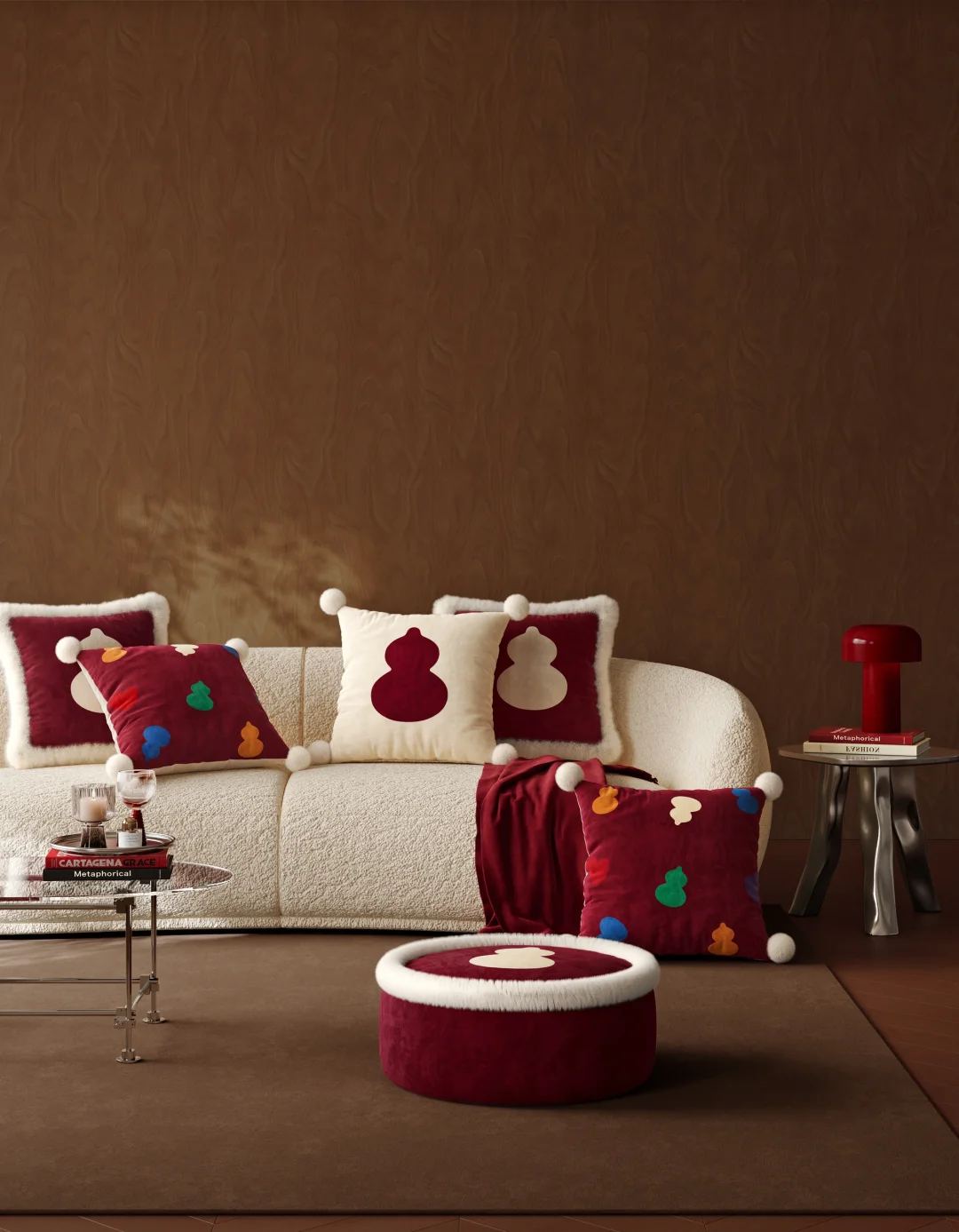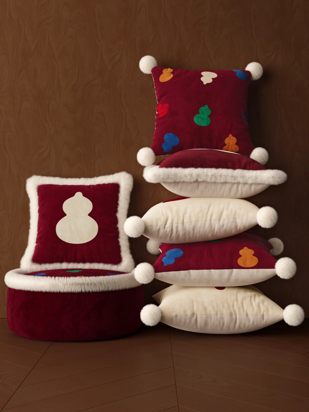 今年的新年软装被这组葫芦抱枕狠狠戳中审美! 酒红 + 奶白的配色高级到尖叫🍷 毛绒绒的质感软 fufu 像抱了团云朵☁️ 重点是这葫芦元素—— “福禄” 谐音直接把新年好彩头焊在抱枕上! ▪️ 撞色款自带活泼感,彩色小葫芦像把春日糖纸揉进冬天 ▪️ 毛绒包边款贵气又温柔,配羊羔毛沙发直接封神 ▪️ 小毛球点缀细节,rua 起来幸福感爆棚!