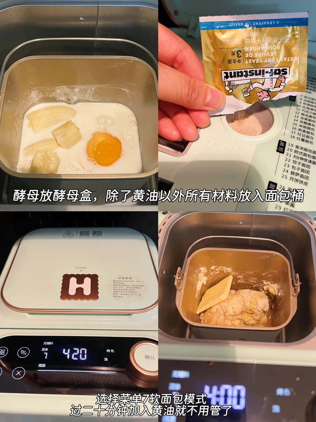 1️⃣酵母放酵母盒,除了黄油以外所有材料加入面包机,选择菜单7软面包模式