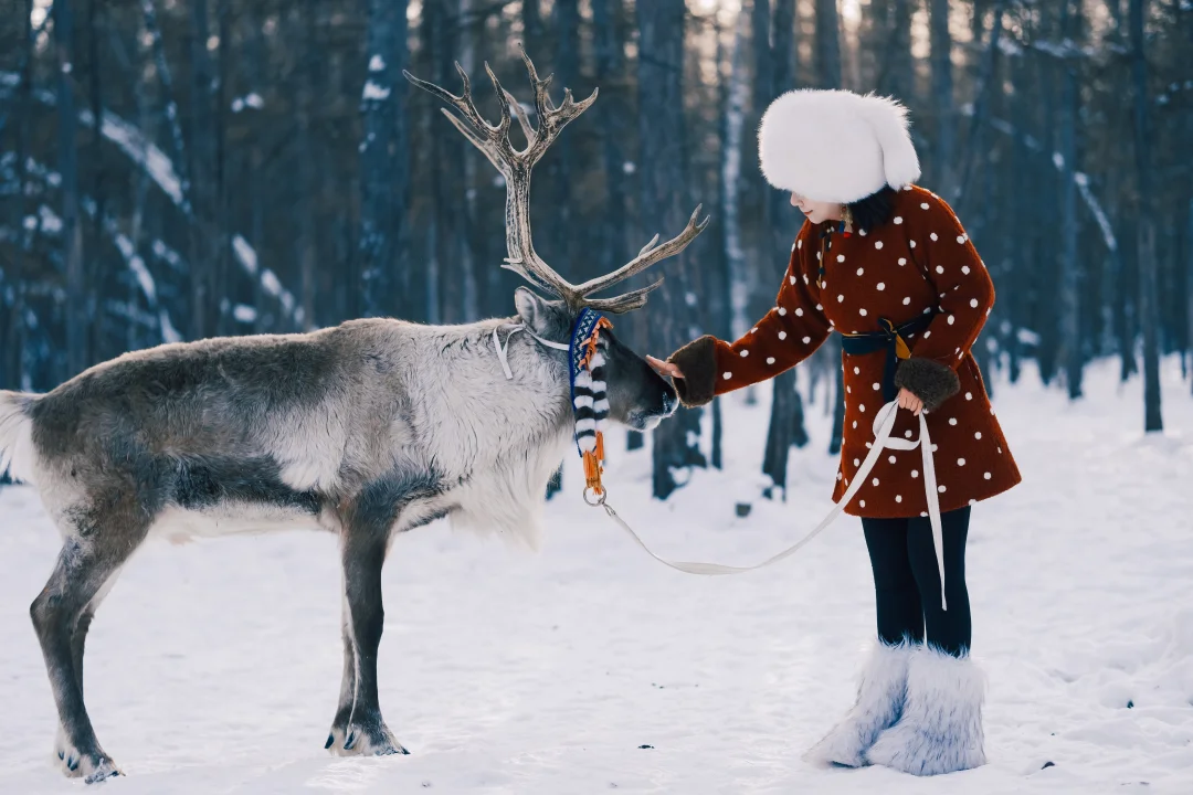 海拉尔漠河北极村定制游 敖鲁古雅是使鹿鄂温克人的聚集地,2003年,政府宣布全面禁猎,鄂温克族部落离开森林 ,迁居敖鲁古雅新乡,驯鹿从山林进入人工围栏圈养。