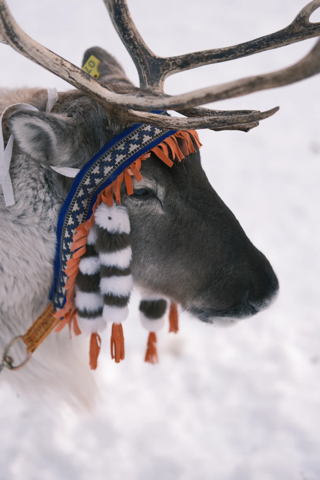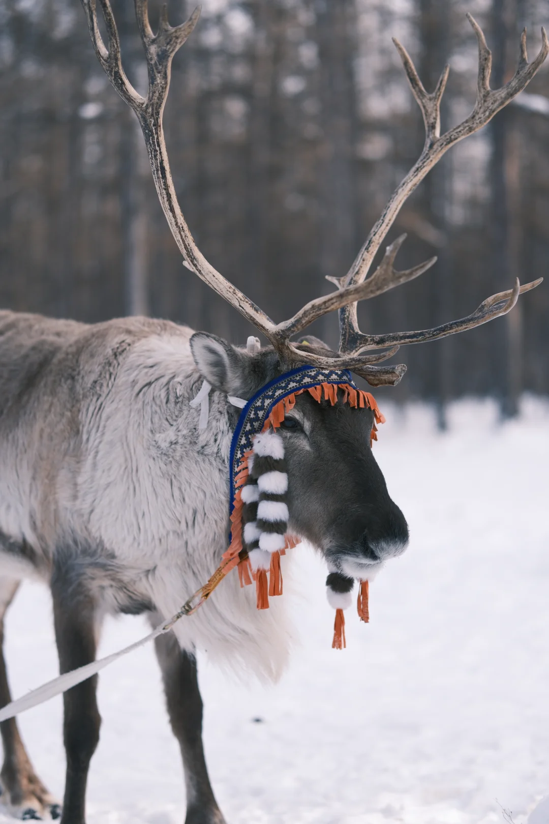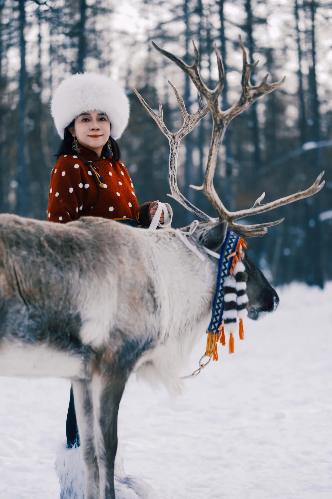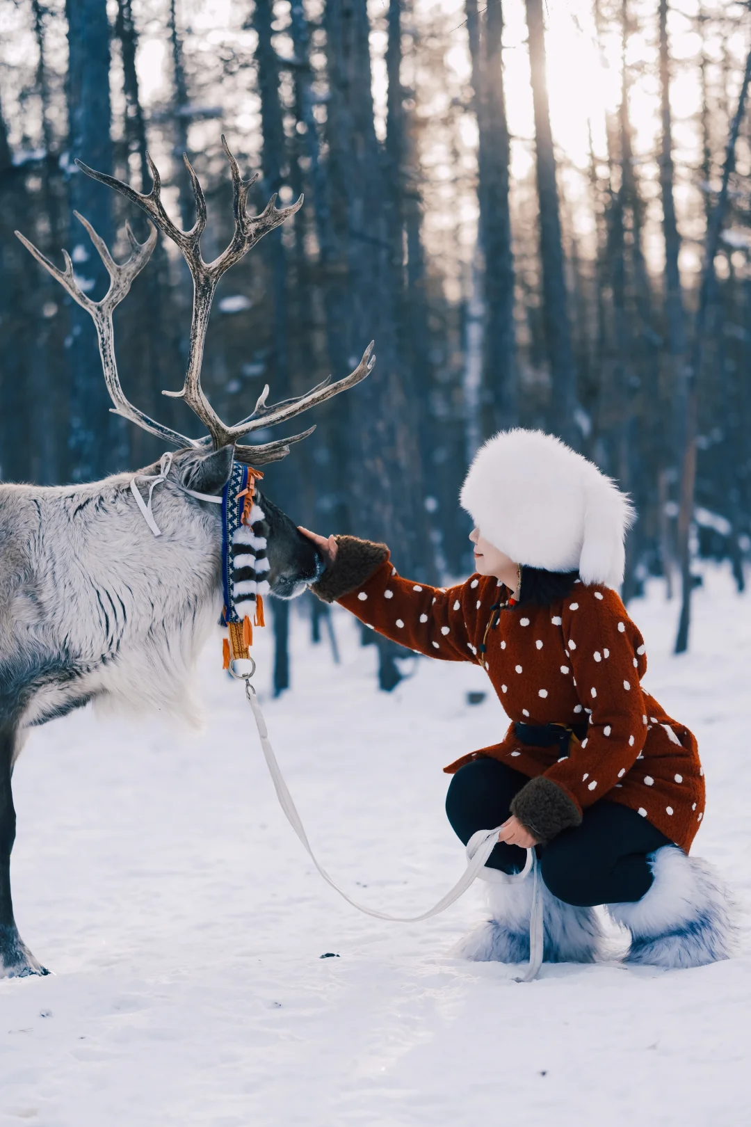 这里的驯鹿没有奈良鹿的臭味,干干净净,漂漂亮亮。我花100元租了一头打扮的花枝招展的驯鹿,牵着它走进树林。驯鹿比想象中的温顺,拍照非常配合。驯鹿场的男人们都像是从瑞幸广告里走出来的。