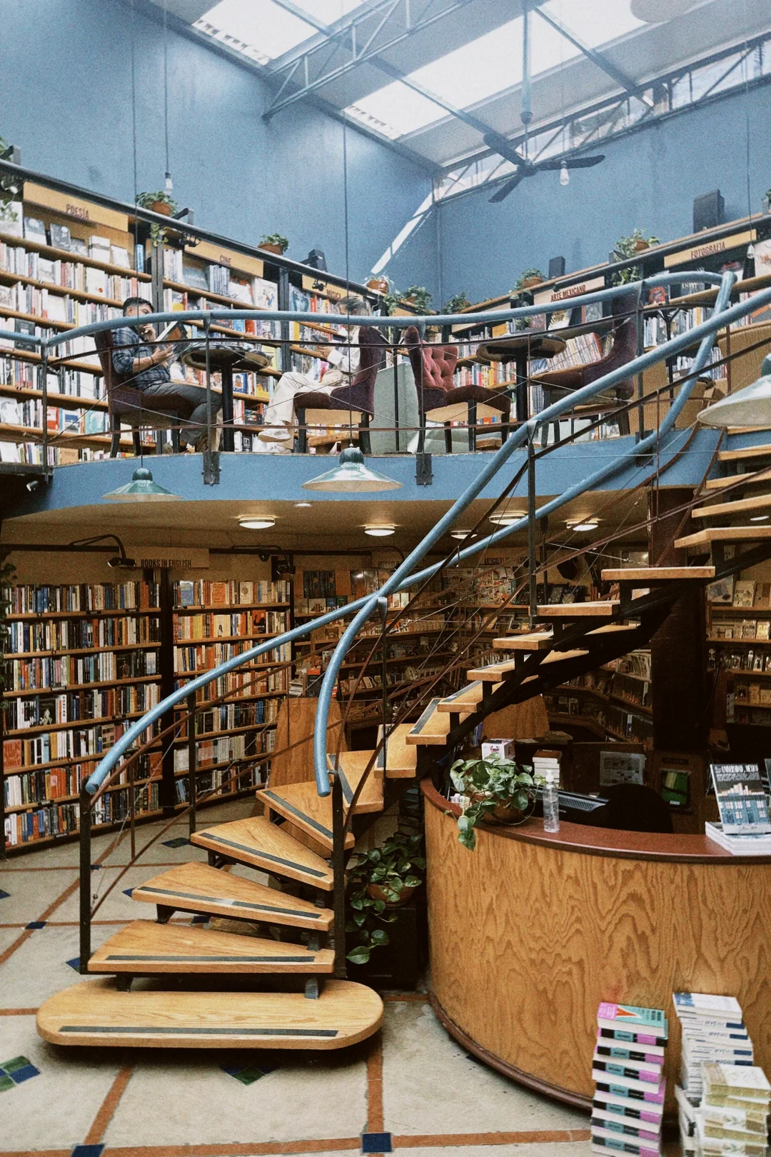 中庭有旋转楼梯和很大的绿植,loft格局,选书也很轻松,童书有专门区域,但数量不多。