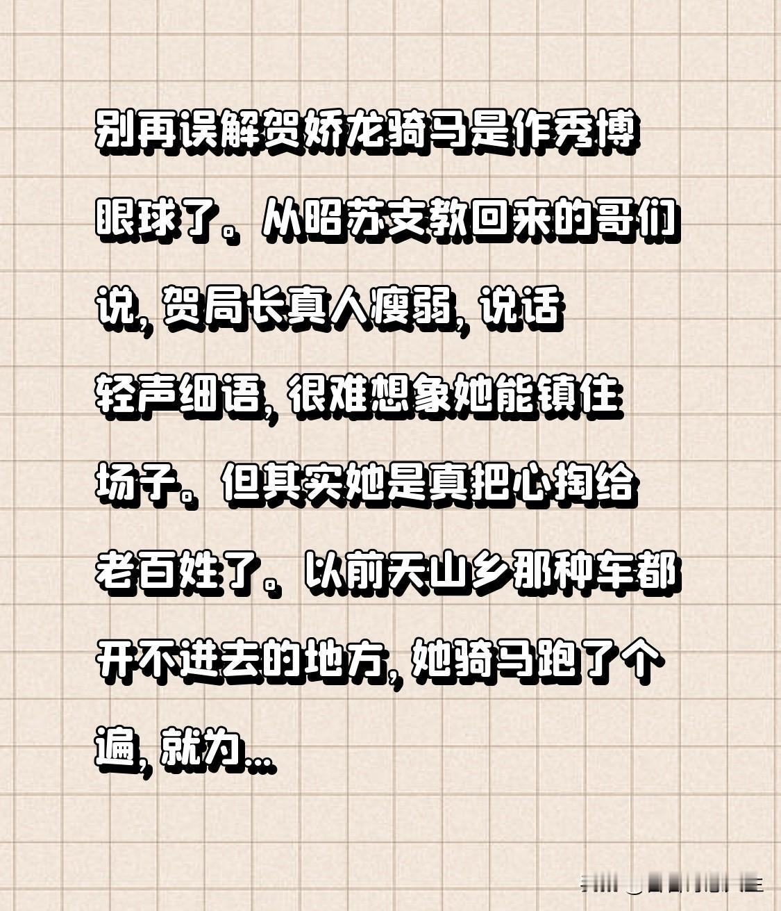 别再误解贺娇龙骑马是作秀博眼球了。从昭苏支教回来的哥们说,贺局长真人瘦弱,说话轻声细语,很难想象她能镇住场子。但其实她是真把心掏给老百姓了。以前天山乡那种车都开不进去的地方,她骑马跑了个遍,就为了好好工作,不是为了拍视频。 2020 年她身披红斗篷策马代言旅游火遍全网,带火了昭苏和伊犁州。可惜 2026 年她工作坠马离世,全网悲痛。很多网友希望为她在昭苏立雕塑,昭苏文旅已上报,大家都想纪念她为助农和宣传新疆做的杰出贡献。 贺娇龙 贺娇龙 贺娇龙坠马事故 贺娇龙坠马 明星 🍑🍑🍑🍏🍏🍏🍐🍐🍐