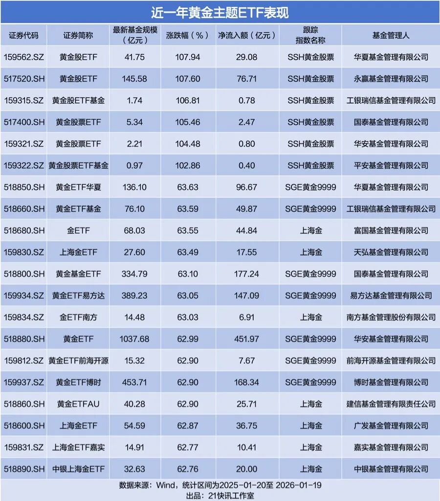 值得注意的是,在金价上行周期中,黄金主题ETF展现出惊人的收益能力。数据显示,共有6只基金的近一年涨幅(2025年1月20日至2026年1月19日)实现了翻倍,且全部为黄金股ETF。