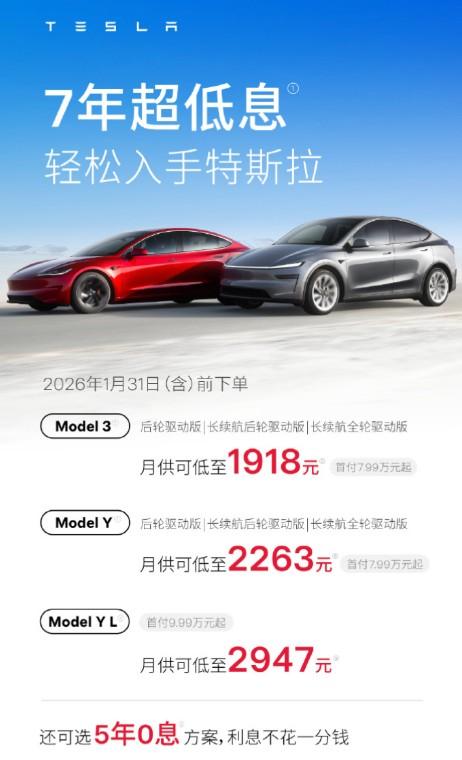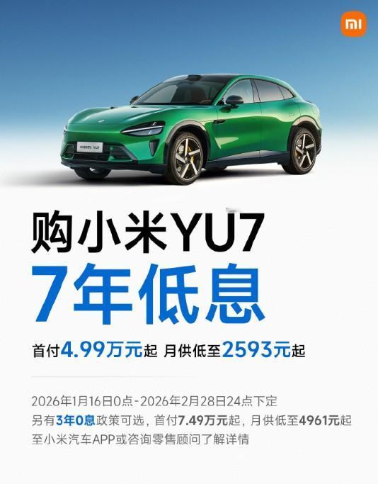 理想也跟进了7年低息购车方案,前两家分别为特斯拉和小米汽车。 1.理想汽车(2026年1月20日推出) 适用车型:全系(L6/L7/L8/L9/i6/i8/MEGA)。 首付:3.25万元起(L6 Pro为例)。 月供:低至2578元起。 利率:L6/L7/L8/L9/i6:年化利率4.69%-4.71%; i8/MEGA:年化利率3.22%-3.23%,且享前3年0息。 2.特斯拉(2026年1月6日推出) 适用车型:Model 3、Model Y、Model YL系列。 首付:7.99万元起(Model 3/Y)、9.99万元起(Model YL)。 月供:低至1918元(Model 3/Y)或2947元(Model YL)。 利率:年化利率约0.98%,7年总利息约6500元。 配套福利:Model YL同步推5年0息方案,叠加国家置换补贴最高省7.5万元。 3.小米汽车(2026年1月15日推出) 适用车型:YU7 首付:4.99万元起,行业最低门槛。 月供:低至2593元起。 利率:年化利率约1.93%,7年总利息约1.42万元。 限时权益:全系赠双零重力座椅,3年0息方案可选(首付7.49万起)。 大家觉得还会有其他车企跟进吗?【来自懂车帝车友圈】