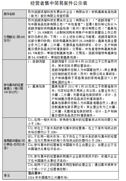 根据经营者集中简易案件公示表,苏州逐越鸿智科技发展合伙企业(有限合伙)(“逐越鸿智”)与中国食品包装有限公司(“中包香港”)签署《股份转让协议》,逐越鸿智拟收购嘉美食品包装(滁州)股份有限公司(“嘉美包装”)29.90%股份(占剔除回购专用账户中股份数量后上市公司股份总数比例,下同)。以上述协议转让为前提,逐越鸿智将发出部分要约收购,拟收购嘉美包装约25.00%股份。嘉美包装主营业务为三片罐、二片罐、无菌纸盒包装的研发、设计、生产和销售及提供各品类饮料灌装服务。交易前,中包香港持有嘉美包装45.78%股份,单独控制嘉美包装。交易后,逐越鸿智持有嘉美包装54.90%股份,单独控制嘉美包装。