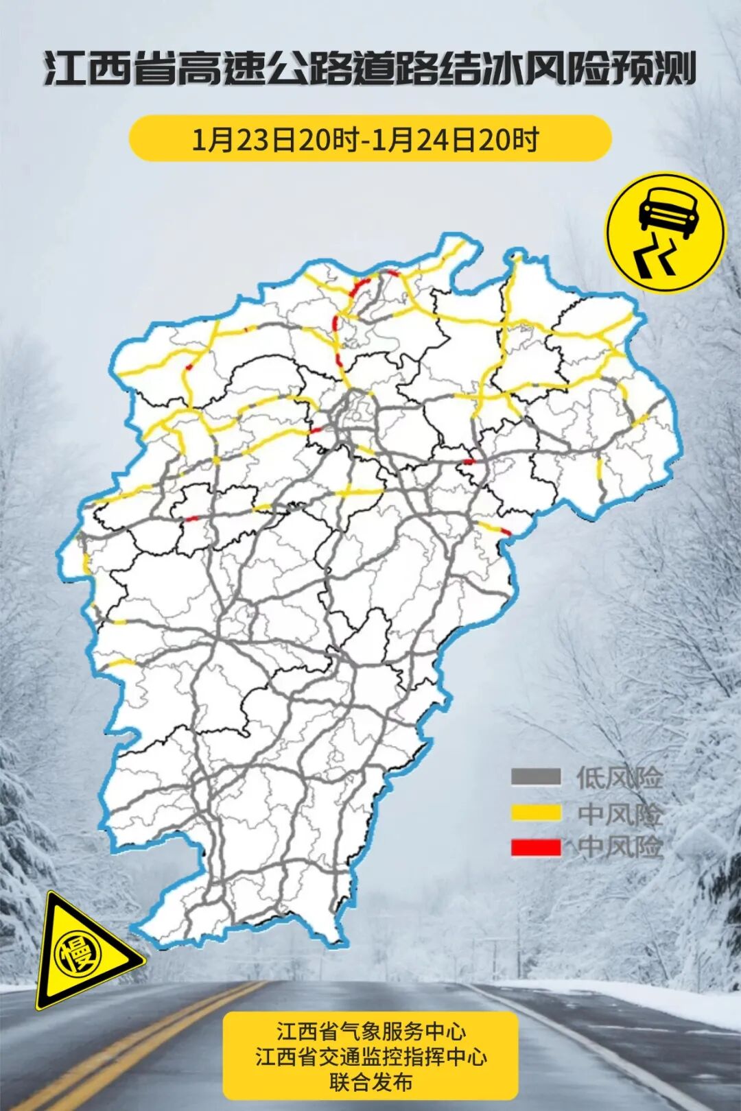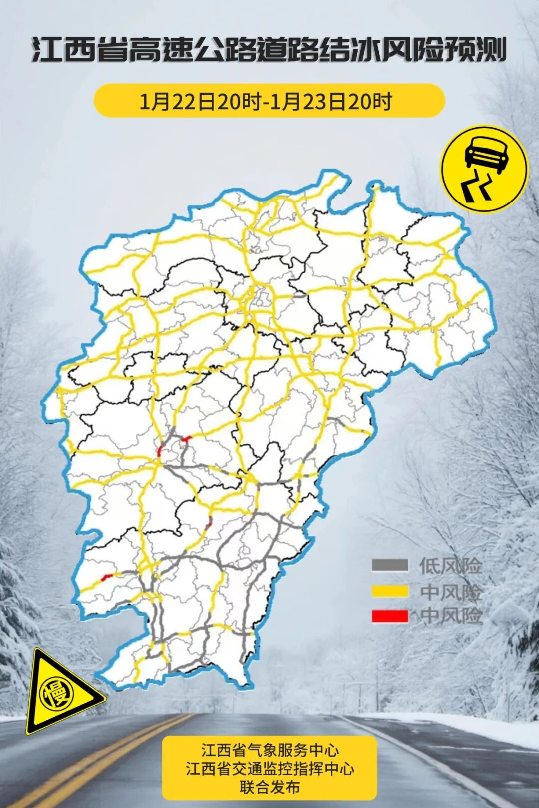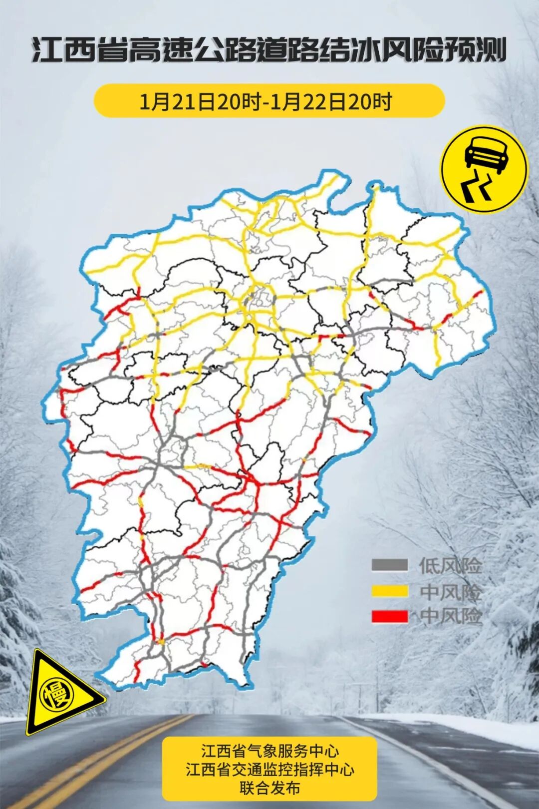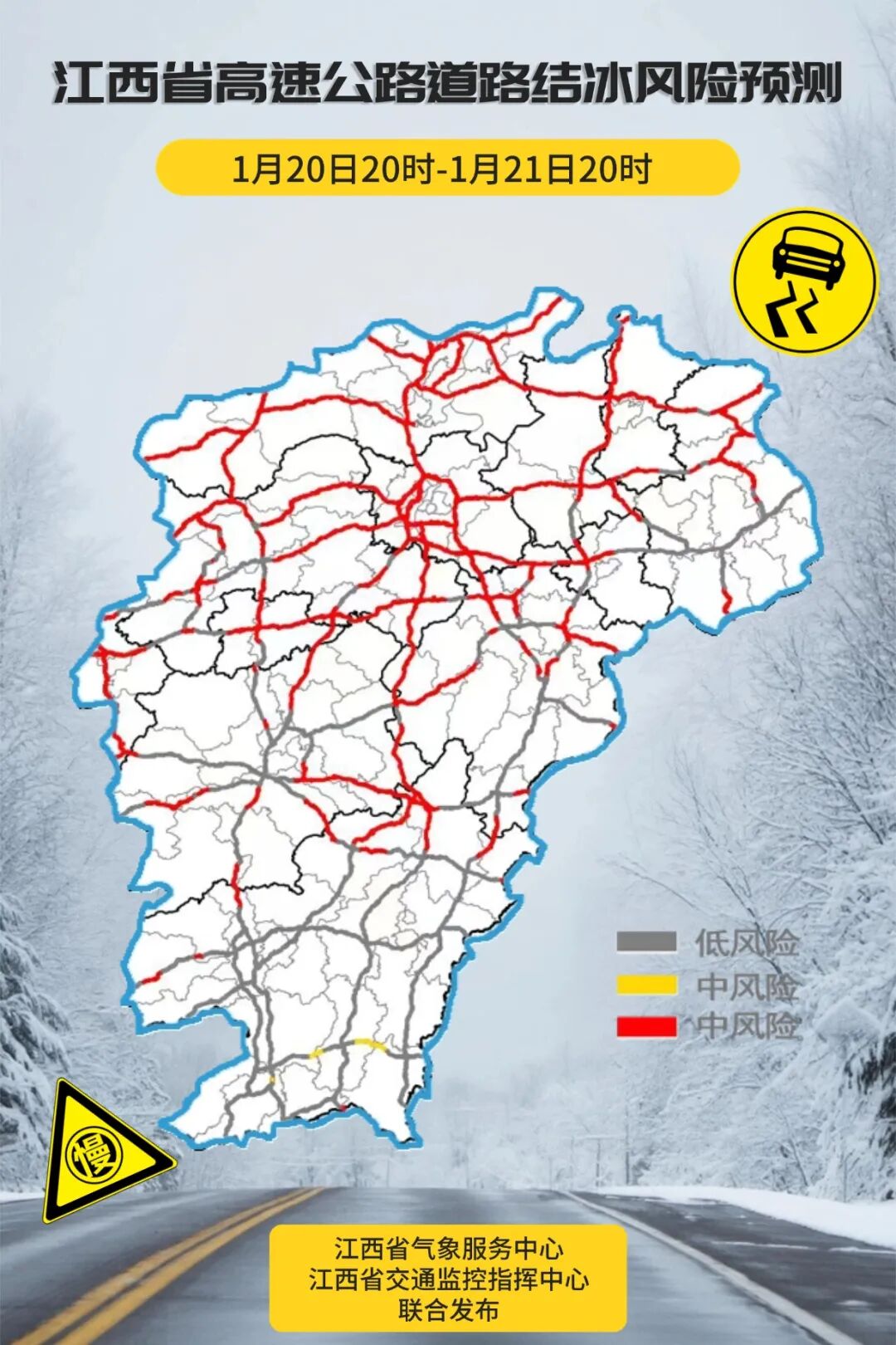 预计未来12小时内,九江、宜春、新余、萍乡、南昌、鹰潭、上饶、景德镇八市和吉安、抚州两市北部的部分地区可能出现对交通有影响的道路结冰。
