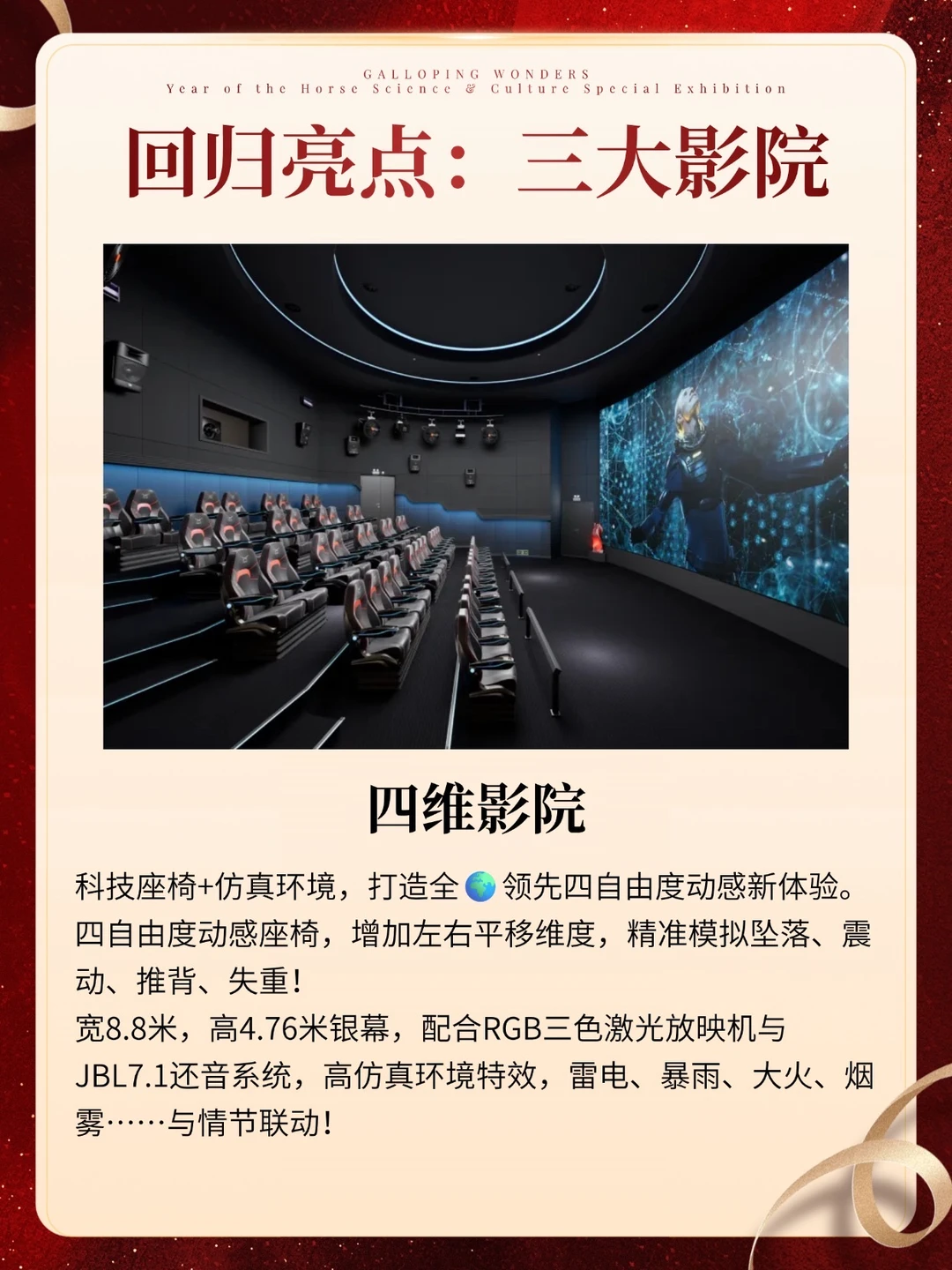 3️⃣四维影院:超先进的四自由度动感体验!配合 RGB 三色激光放映机、JBL7.1 还音系统等等!