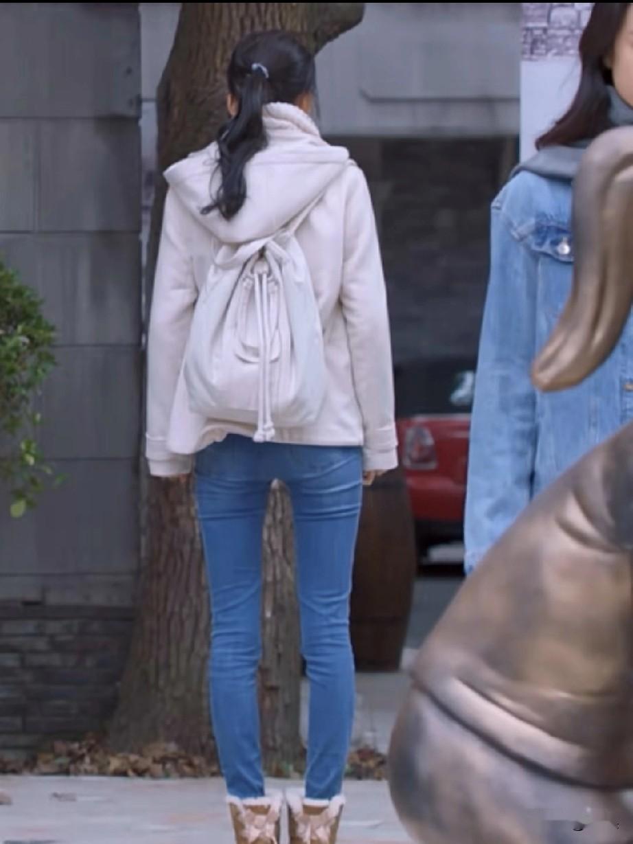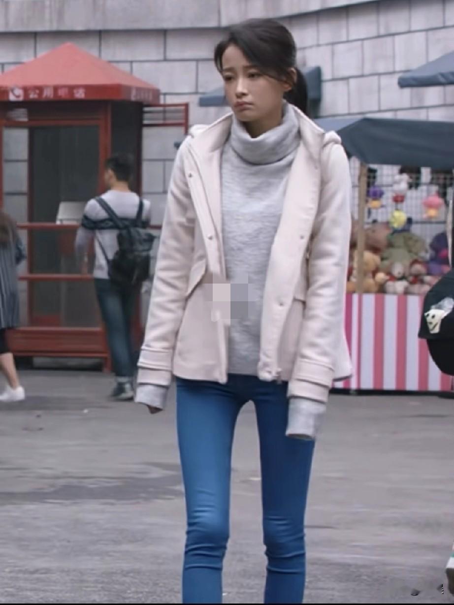 孙怡在街头,浅灰色高领毛衣、米白色外套和蓝色牛仔裤