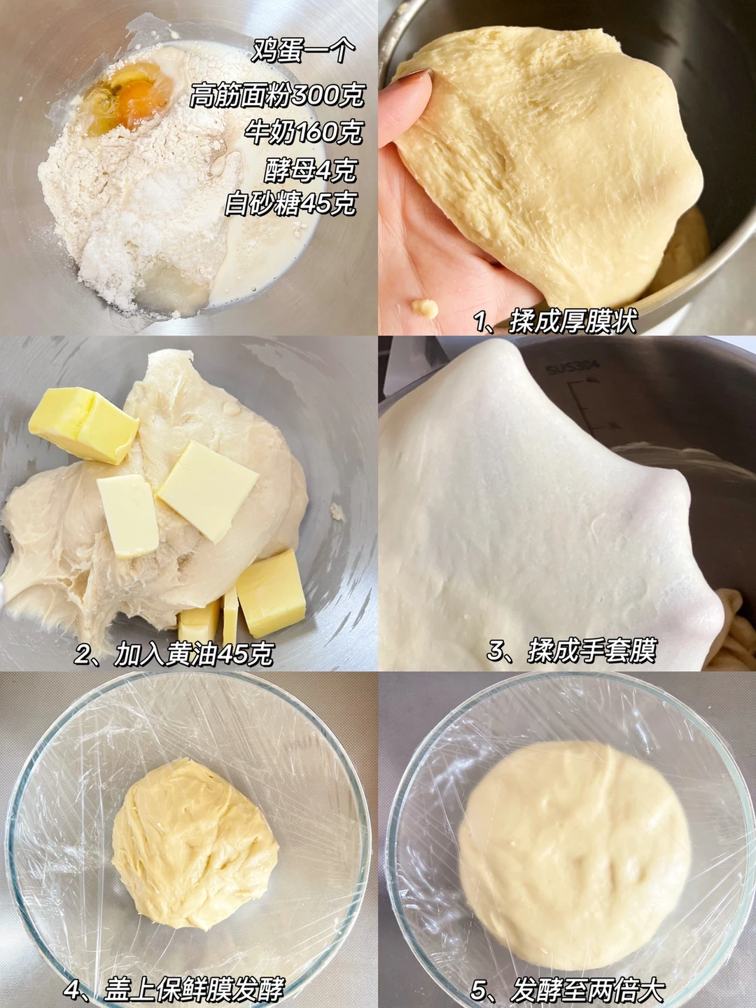 1、除去黄油外,所有材料混合揉成厚膜,然后加入黄油,继续揉出手套膜的状态就可以啦
