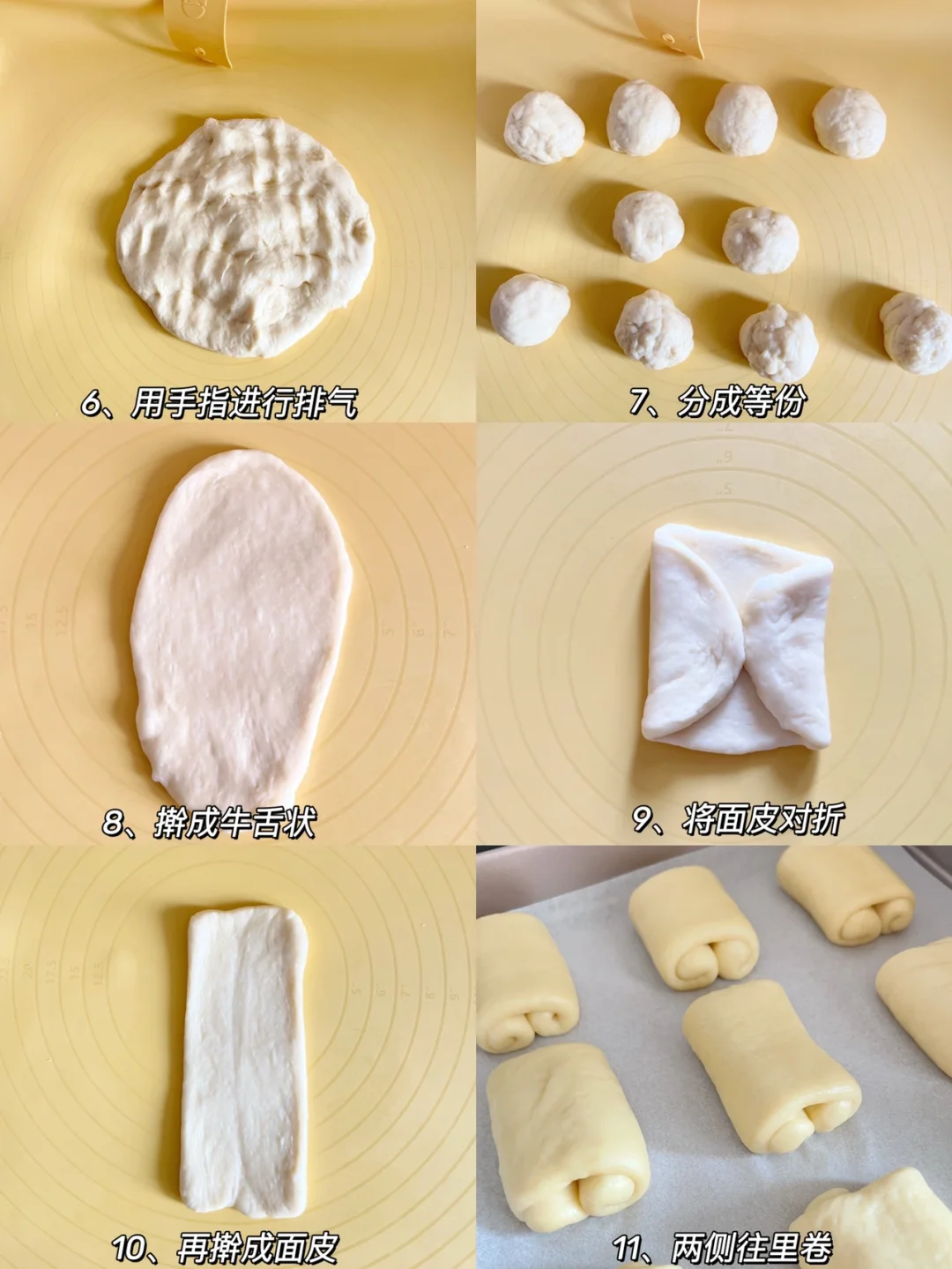3、发酵按压排气,分成等份,擀面杖压成牛舌状,对折后,再擀成面皮,对折卷起来(如图)