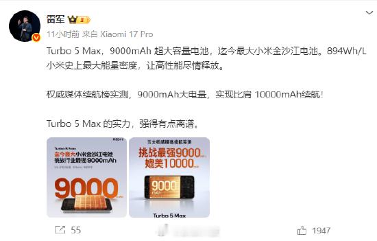 【雷军称新机强得离谱】小米创办人雷军1月19日深夜发文称,Turbo 5 Max,9000mAh 超大容量电池,迄今最大小米金沙江电池。894Wh/L 小米史上最大能量密度,让高性能尽情释放。权威媒体续航榜实测,9000mAh大电量,实现比肩 10000mAh续航!Turbo 5 Max 的实力,强得有点离谱。小米MiMo模型API平台开放充值功能雷军称9000mAh比肩10000mAh续航