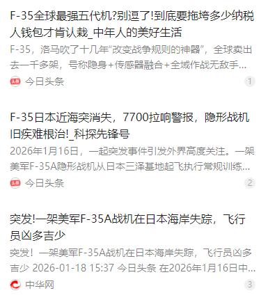 到处耀武扬威的美军,终究被“上天”收拾了! 1月16日上午,一则炸裂消息传来:美国号称“全球最先进”的F-35A隐形战机,在飞往毗邻东海的日本青森附近敏感海域时,突然挂出“7700”紧急代码——这可是意味着“死神叩门”的致命警报啊!可短短10秒后,战机就从雷达上彻底消失,连一句完整的呼救都没留下。 麻烦看官老爷们右上角点击一下“关注”,既方便您进行讨论和分享,又能给您带来更多优质的内容,感谢您的支持! 2026 年 1 月 16 日上午,一则炸裂消息在国际上掀起波澜。美军一架号称 “全球最先进” 的 F-35A 隐形战机,从日本三泽基地起飞执行常规训练任务,飞往青森县以东海域时,于北京时间 11 时 09 分突然挂出 “7700” 紧急代码。这可不是普通警报,而是航空领域最高级别的致命信号,意味着战机遭遇了飞行员无法自主处置的严重故障。 让人揪心的是,信号发出后没多久,这架战机就从雷达和 ADS-B 系统中彻底消失,连一句完整的呼救都没留下。后续美日联合搜救队证实,战机已坠毁,当天 19 时许就在事发海域找到垂直尾翼残骸、机身碎片以及燃油泄漏形成的油污带。 可飞行员的下落一直牵动人心。1 月份的青森近海,海水温度只有 7 到 9 摄氏度,海洋医学数据显示,即便穿着专业救生服,人体在这种水温里最多撑 3 到 4 个小时,超过 6 小时失温致死概率达 90% 以上。更糟的是,当天青森县积雪深度突破纪录,达到 438 厘米,暴雪、浮冰和巨浪让搜救难度陡增,飞行员生还希望十分渺茫。 这起事故绝非偶然,而是 F-35 系列战机长期 “带病服役” 的必然结果。美国政府问责局 2025 年底的报告显示,该系列战机仍有 873 项未修复缺陷,其中 13 项是致命级问题,像供氧系统异常、飞控软件故障等都多次引发争议。 作为单发战机,F-35A 的设计本身就存在先天短板。它只靠一台普惠 F135 发动机提供动力,一旦发动机出现故障,就完全失去推力,远海环境下几乎没有容错空间。而这台发动机向来 “娇贵”,美军数据显示,F-35A 每飞行小时故障率在 0.8-1.2 次,发动机问题占了三分之一,高温合金叶片易裂纹、需频繁拆解维修。 维护成本更是天文数字,单台发动机大修一次要几百万美元,全寿命周期维护费用预计超 1 万亿美元,比买飞机的钱还多。可即便如此投入,发动机升级计划从 2018 年喊到 2026 年仍未落地,原定于 2025 年交付的升级方案,直接推迟到 2028 年以后。 美军自己都承认,F-35A 的完全任务能力率仅为 51.5%,意味着近半数战机随时无法执行完整作战任务。截至 2025 年底,该系列已发生十余起严重事故,其中至少五起是坠机,2019 年日本航空自卫队一架 F-35A 就曾在同一海域失联坠毁。 此次事故还和美军在西太平洋的高强度军事部署脱不了干系。事发前一天,美军刚在琉球群岛大规模集结 F-35A 机群,满功率升空开展训练。长期以来,美军在该区域频繁搞抵近侦察、联合演训,战机和人员都处于高负荷运转状态,这种 “到处秀肌肉” 的模式,无疑加速了装备损耗和隐患暴露。 青森附近海域的高湿度、高盐雾环境,也让战机面临更严苛的考验,对发动机和电子部件的腐蚀效应明显,进一步放大了故障风险。可美军为了维持霸权存在感,根本不顾装备承受能力,硬是让战机在恶劣环境中 “硬撑” 执行任务。 这起事故给日本等盟友敲响了沉重警钟。日本为采购 F-35 投入巨额资金,原本寄予厚望,如今同一海域两次发生类似事故,让这款 “最先进战机” 的神话彻底褪色。美军原计划 2026 年春季在三泽基地部署 48 架 F-35A 替换 F-16 的方案,也因这次事故被迫推迟,亚太前沿空中力量布局陷入不确定性。 不止日本,英国、澳大利亚、以色列等全球用户都曾为 F-35 的可靠性和维护成本发愁,纷纷吐槽 “买得起、飞不起、修不起”。这次坠毁事件,让更多国家开始重新审视这款战机的实际作战价值。 从更深层来看,这起事故折射出现代军事体系过度依赖技术堆叠的弊端。F-35 系列堆砌了大量先进技术,却忽视了可靠性和容错率这些基础指标,导致看似先进的战机,在复杂环境和高强度部署下不堪一击。 美军总想靠先进装备在全球耀武扬威,动辄把战机派到别人家门口 “秀肌肉”,却忘了装备再先进也经不起长期折腾,隐患再小也会在高频使用中放大。这次 F-35A 的坠毁,与其说是 “上天” 的惩罚,不如说是美军霸权逻辑下的必然结果。