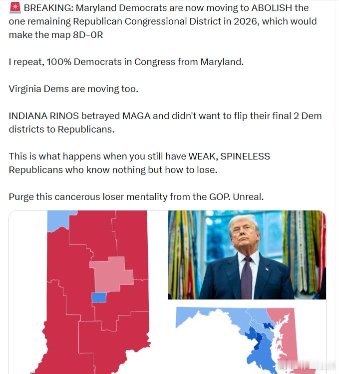 马里兰州的民左党人现在正计划废除州内最后一个共和党国会选区(2026年),这将使选区分布变为8个民主党席位、0个共和党席位。马里兰州国会将100%由民左党控制。弗吉尼亚州的民左党人也在行动。印第安纳州的温和共和党人(RINOs)背叛了MAGA,他们不愿把最后两个民左党选区翻成共和党。这就是当你党内仍有软弱、毫无骨气的共和党人,只会输的时候会发生的事。