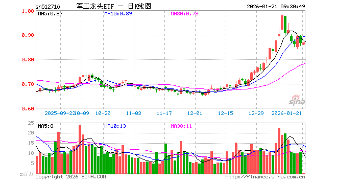 军工龙头ETF(512710)业绩比较基准为中证军工龙头指数收益率,管理人为富国基金管理有限公司,基金经理为牛志冬、王乐乐,成立(2019-07-23)以来回报为73.55%,近一个月回报为21.56%。