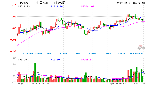 1月21日,中国A50ETF南方(159602)开盘跌0.19%,报1.030元。中国A50ETF南方(159602)重仓股方面,宁德时代开盘涨0.67%,紫金矿业涨1.21%,工业富联跌1.61%,贵州茅台涨0.00%,海光信息涨3.65%,寒武纪跌0.57%,比亚迪跌0.77%,恒瑞医药涨0.02%,立讯精密跌1.41%,中际旭创涨0.21%。