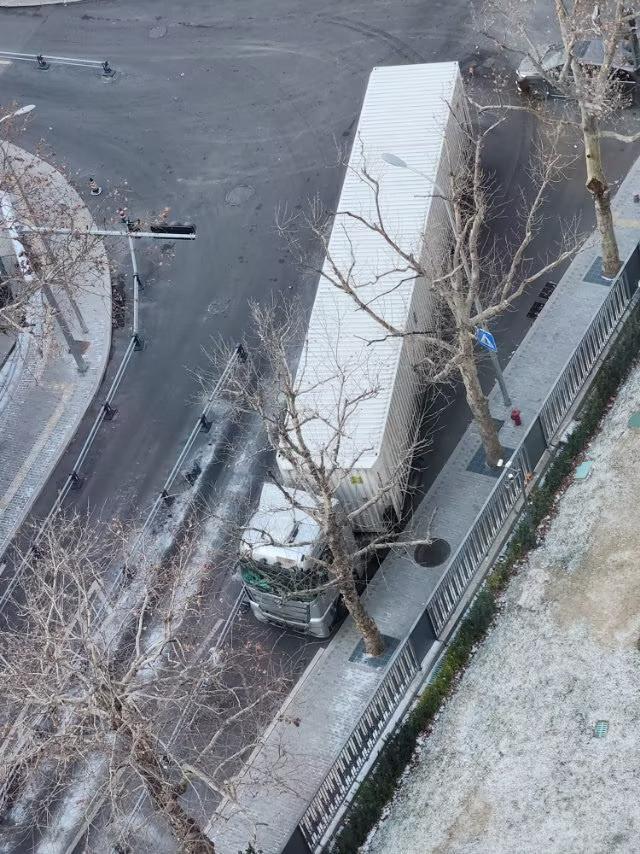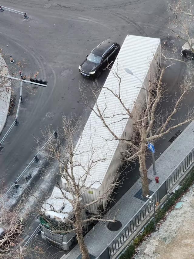 遇到大货车应注意什么你知道吗? 小区门口放了一辆大货,这种大货青岛不会让它白天进