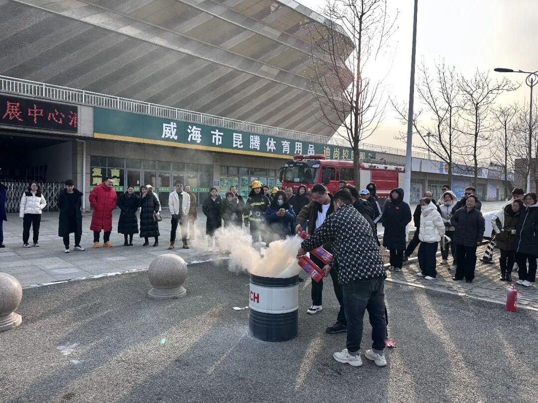 理论讲解结束后,应急疏散演练及灭火现场教学随即展开。随着警报声响起,参训人员捂住口鼻,低姿弯腰沿安全通道快速有序撤离,全程紧张高效、秩序井然。灭火现场教学环节,文登区消防大队宣传员详细演示灭火器的使用方法与操作步骤,并组织参训人员上手实操,切实提高应急救护能力。