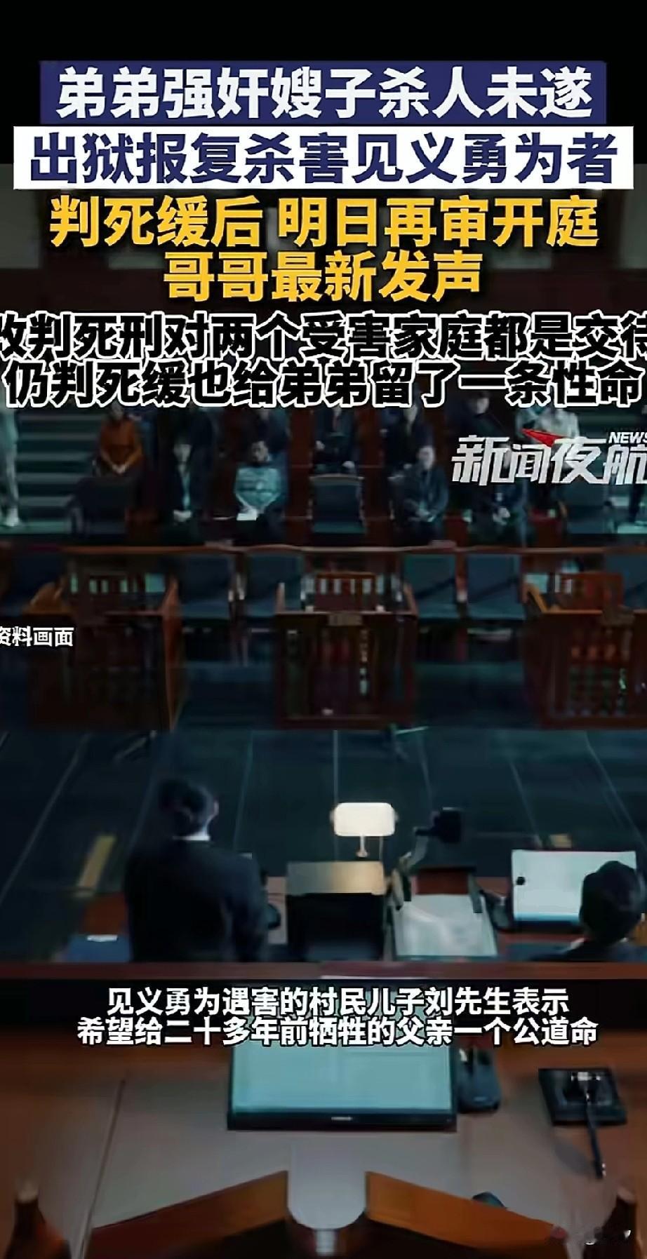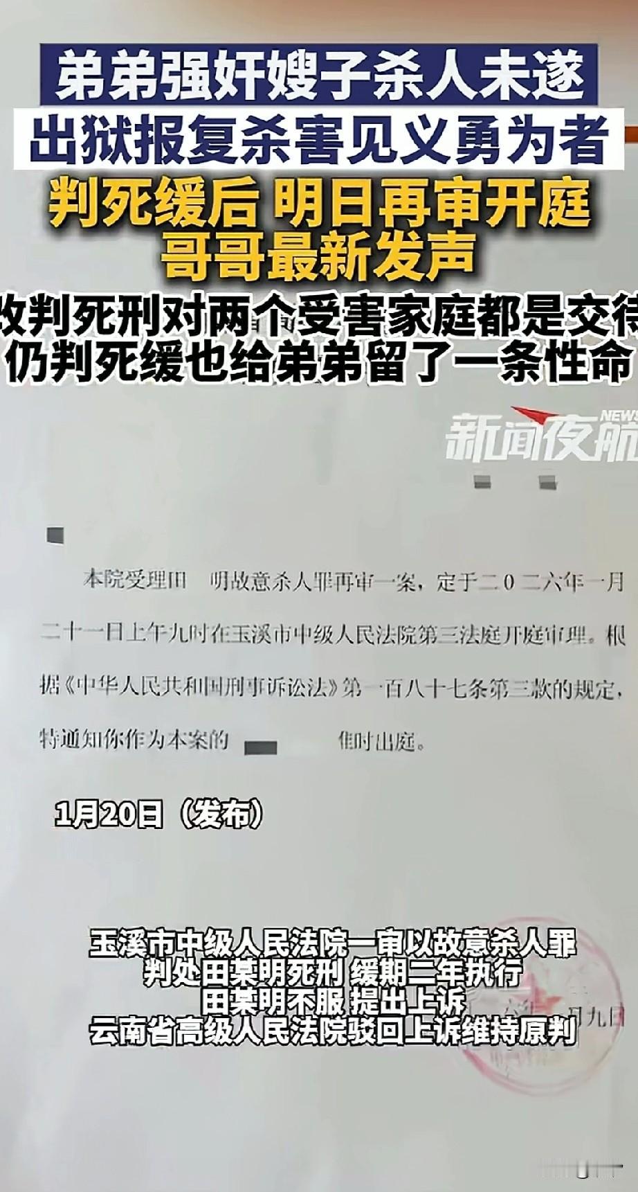 刷到媒体报道的这则新闻,直接让人震碎三观,弟弟强奸嫂子,杀人未遂,出狱后竟然报见义勇为者致死! 被判死缓,马上要再次开庭,她的哥哥最新发声,或许该判死缓是对两个家庭的负责任,也是给自己的弟弟留了一条命! 据了解1996年6月20号,时年20岁的田某明居然拿刀威胁自己的嫂嫂,强行和嫂嫂发生关系, 完事儿,为了毁灭证据,居然想杀自己的嫂嫂赵女士,结果却被同村的刘先生发现了, 随后刘先生立即报报警,田某明的嫂嫂这才侥幸活下来,在外打工的哥哥听闻此,立刻赶回了家! 这件事在当时云南轰动一时,当地叔叔很快将犯罪嫌疑人抓获,田某明自然被判了刑! 本以为这 事就这么结束,可谁也没想到,多年过后,田某明出狱后,居然直接将见义为的村民刘某杀害! 事发之后,田某明再次被抓,这次可不是强奸嫂嫂这么简单了,这次是故意杀人罪! 当地玉溪法院一审判决死刑,缓期两年执行,但是田某明不服,提起了上诉,云南省最高法院维持原判! 现在又要进入二审,他的哥哥早已经原谅了这个弟弟,他对于二审的判决不抱任何打算! 还对记者表示如果改判死缓,也是给两个家庭最好的答案,毕竟给弟弟留了一条性命! 但是被害村民刘先生的儿子依旧希望维持原判,还自己父亲一个公道! 这个田某明不仅强奸嫂嫂,还杀害村民,可以说是个无恶不作的主,这样的人如果给他机会,不知道出来还会犯下什么样的罪! 网友表示这是他的哥哥面对家庭撕裂,无奈做出的平衡抉择! 还有网友表示这样的人,应该依法处理,不能轻饶! 大家对于田某明这事怎么看?不妨聊一聊! 我的家庭相册 云南 嫂子故事
