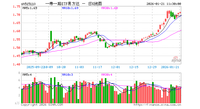 一带一路ETF易方达(515110)业绩比较基准为中证国企一带一路指数收益率,管理人为易方达基金管理有限公司,基金经理为刘树荣,成立(2019-11-06)以来回报为71.05%,近一个月回报为10.28%。