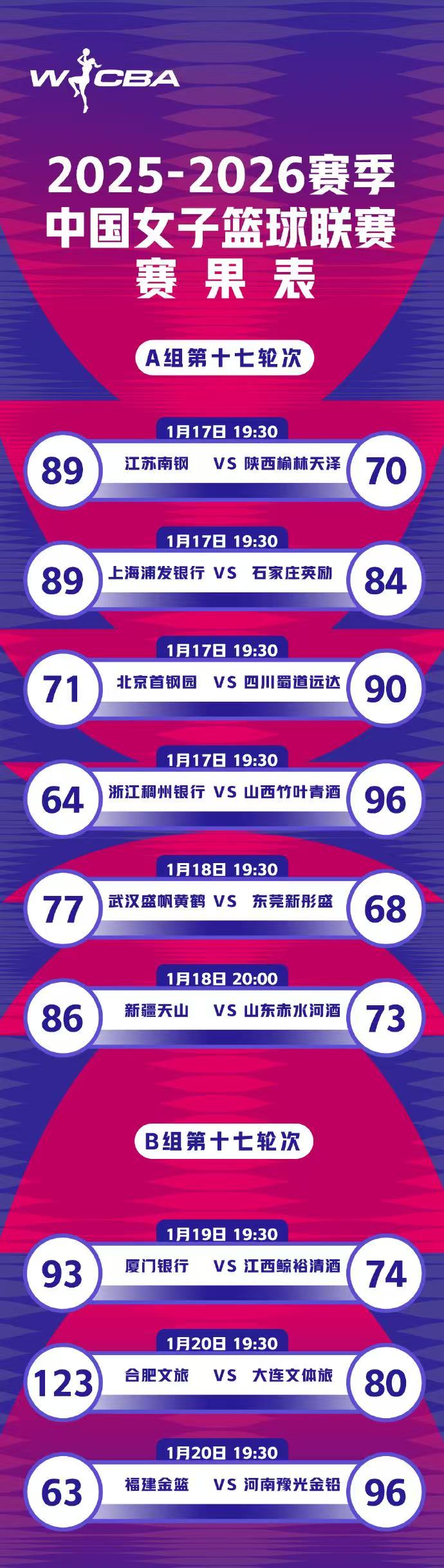 虎扑01月21日讯WCBA官方分享第十七轮赛果表:合肥文旅轰下新高。