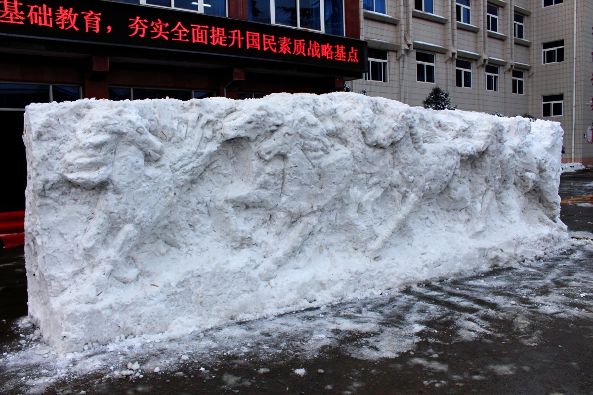 当寒冬积雪遇上青春巧思,校园里便诞生了别样风景。1月20日,河南济源四中40余名师生自发集结,仅凭铁锹、簸箕、小铁铲等日常劳动工具,共同打造出长达近5米、高2米、厚1米的“八骏图”雪浮雕,为即将到来的建校80周年献上独特礼物,更让传统文化在劳动实践中焕发新生。