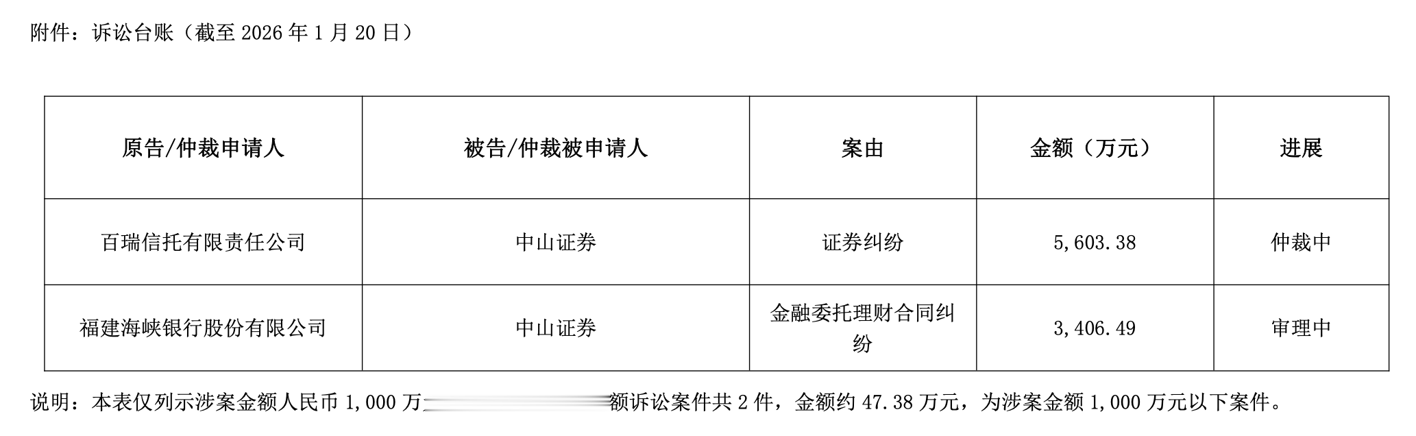 公告还显示,锦龙股份及控股子公司在过去十二个月内累计涉及的诉讼、仲裁事项涉案金额合计约9057.25万元,占公司最近一期经审计净资产的3.77%。其中涉案金额超过1000万元以上的有两起,分别是中山证券与百瑞信托有限责任公司之间的证券纠纷,涉案约5603万元,以及与福建海峡银行股份有限公司的金融委托理财合同纠纷,涉案金额约3406万元。除了这两起超过1000万元的案件,还有2件小额诉讼案件,金额合计约47.38万元。