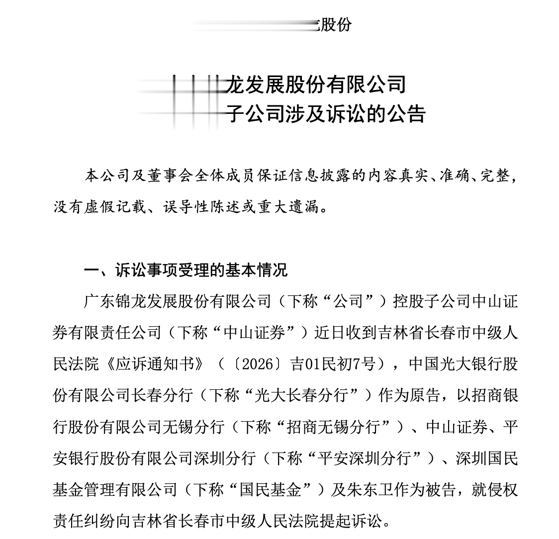 2026年1月20日晚,锦龙股份(000712)发布公告,其控股子公司中山证券有限责任公司卷入一起总额高达4.89亿元的侵权责任纠纷。