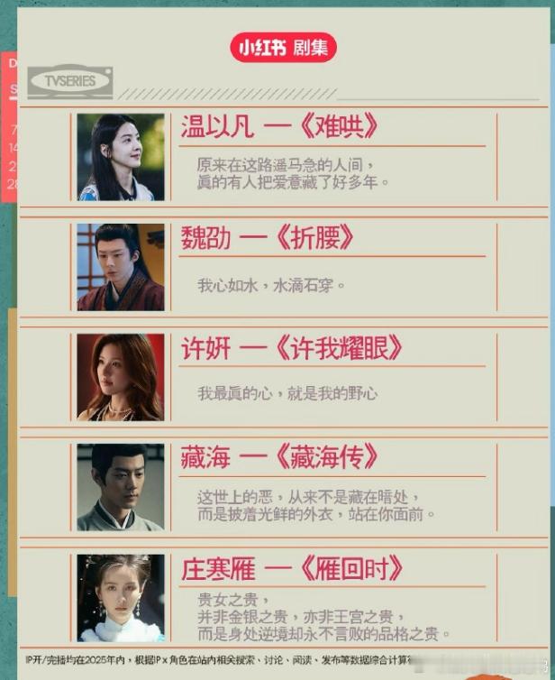 隔壁平台选的年度剧集十大角色《难哄》男女主白敬亭和章若楠,双双上榜,《入青云》男女主侯明昊和卢昱晓双双上榜,其他几部剧只有一番主演上榜,刘宇宁除外,刘宇宁凭借《折腰》的二番男主上榜,其余几位分别是《白月梵星》白鹿,《国色芳华》杨紫,《许我耀眼》赵露思,《藏海传》肖战,《雁回时》陈都灵。