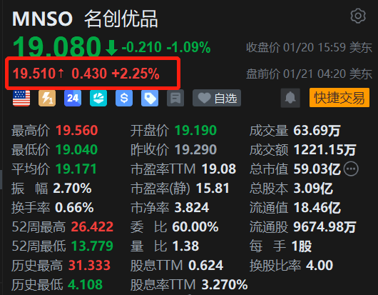 格隆汇1月21日|名创优品(MNSO.US)美股盘前涨2.2%报19.51美元。消息上,名创优品公告称,该公司于2026年1月20日斥资24.59万美元回购5.13万股股份,每股回购价格为4.7625-4.875美元。另外,摩通最新报告指,马年内需股首选老铺黄金、古茗、名创优品、百胜中国、泡泡玛特等。