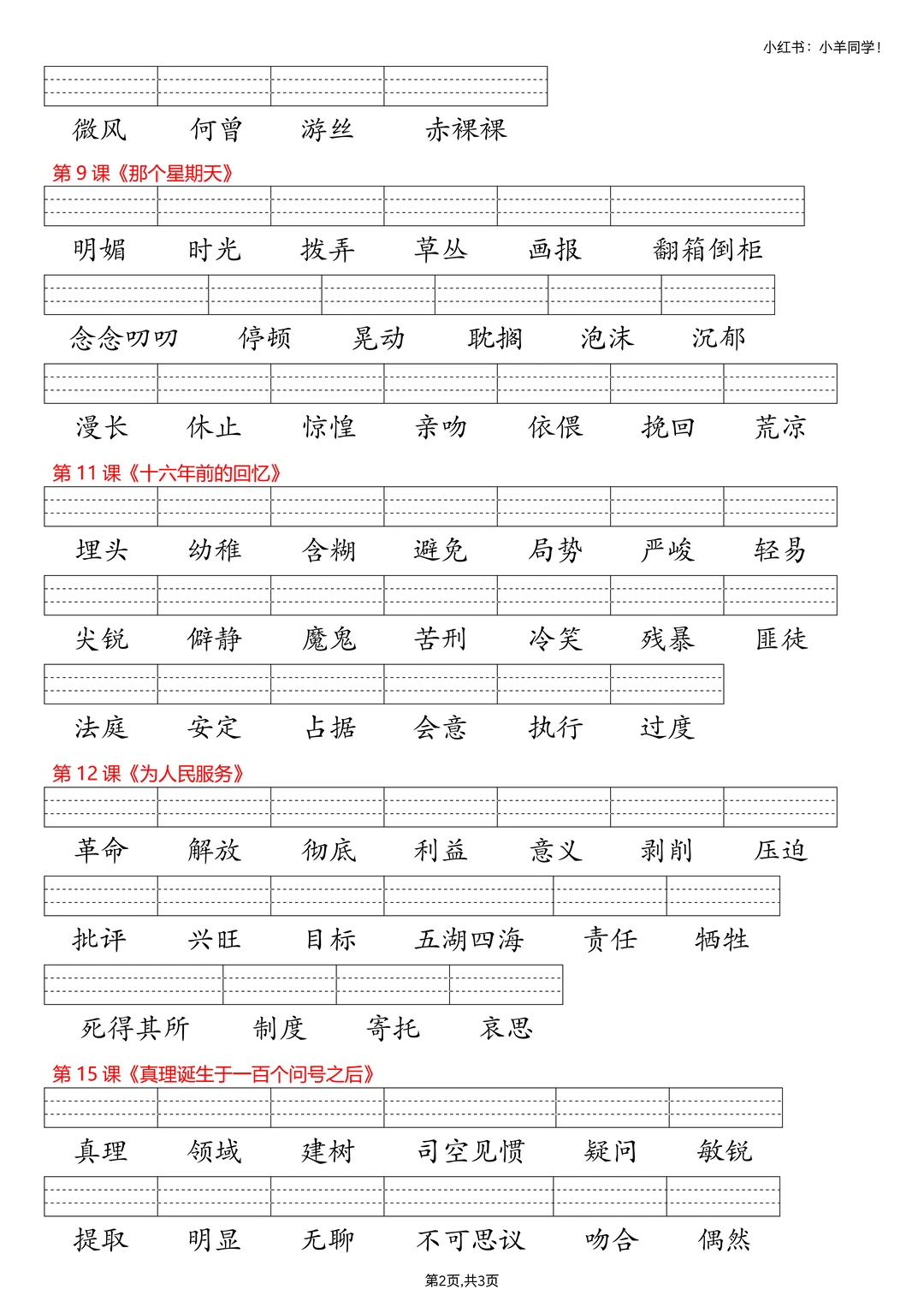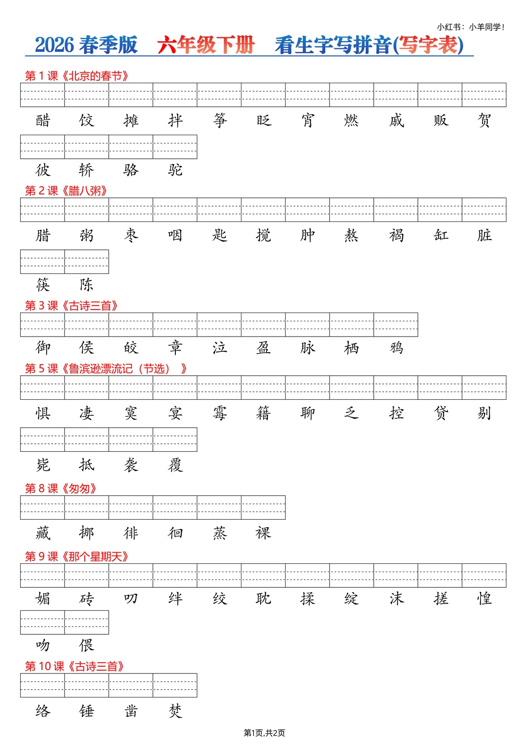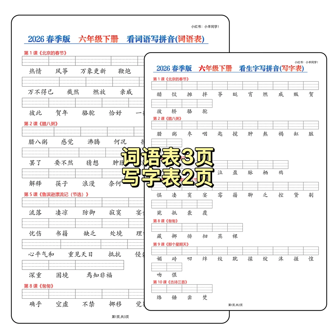 👀 拼音基础弱的娃看过来~ ❌ 不少孩子到五六年级还分不清 b/d、in/ing 💯 字词拼音题千万别失分呀! ✨ 这份课后三表(识字表 + 写字表 + 词语表) ✅ 看生字写拼音专项练习,强化基础超实用~ 💪 拼音稳稳的,语文起步更轻松! ⚠️原创整理,禁止转载发布网络平台或商用。