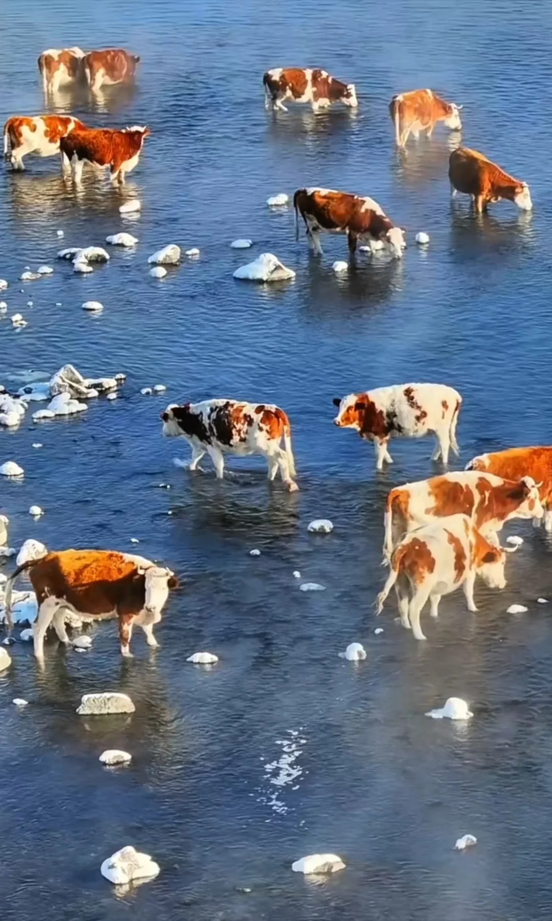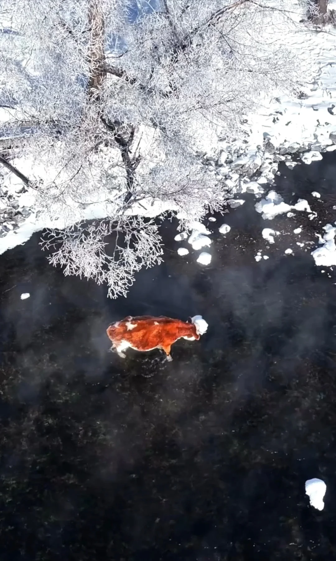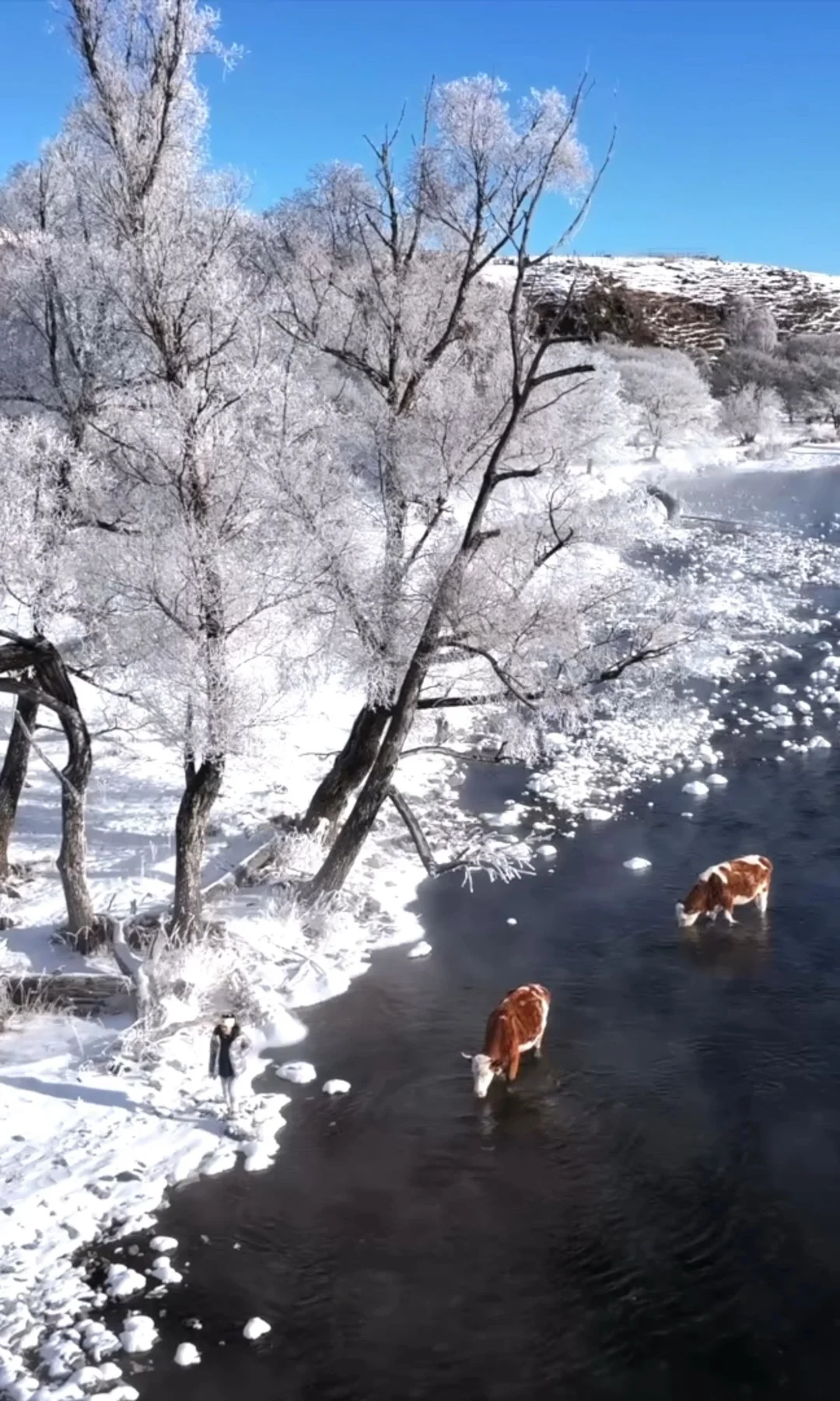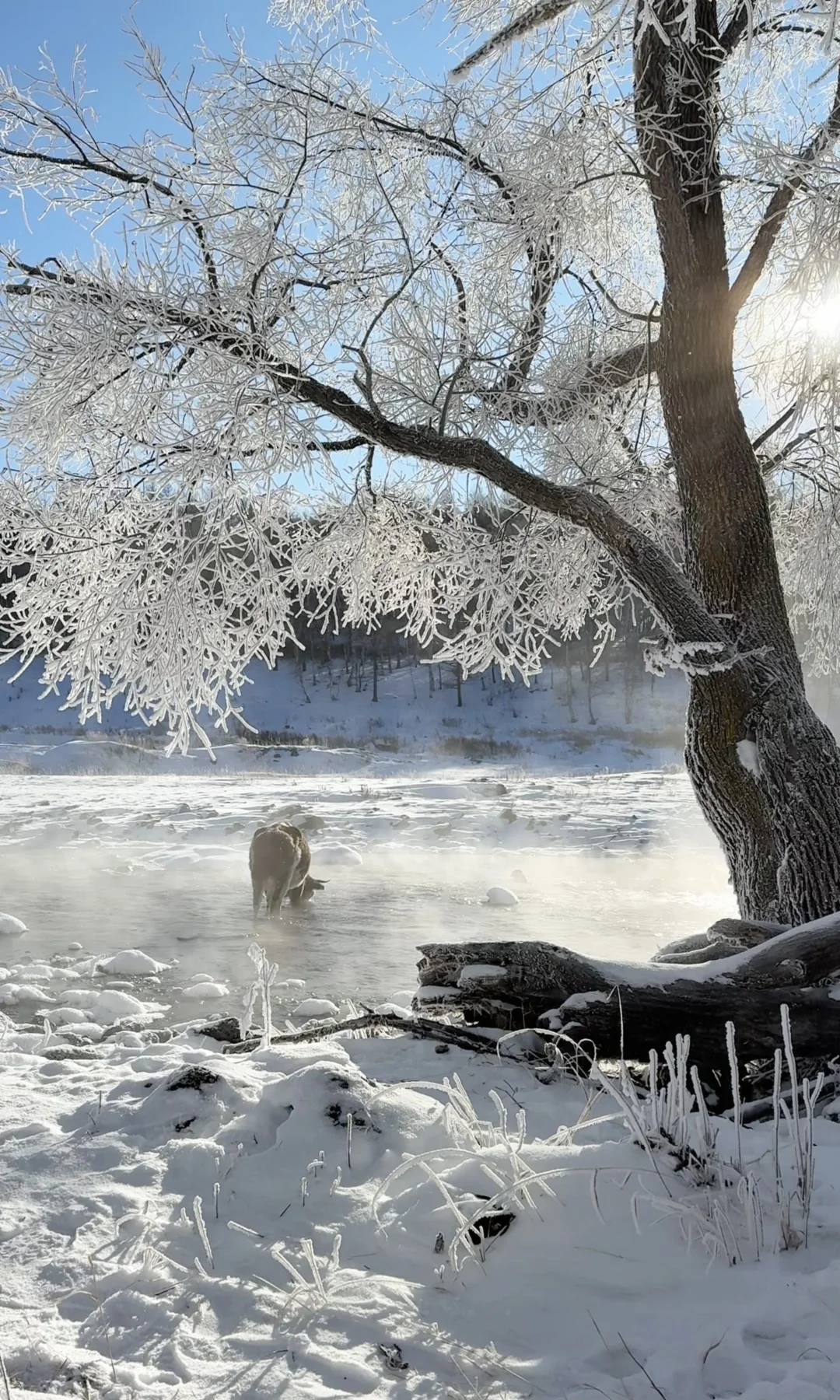 ❹ 不冻河畔看晨雾:河面热气蒸腾,牛羊沿岸散步,宛如仙境遗落的温暖秘境