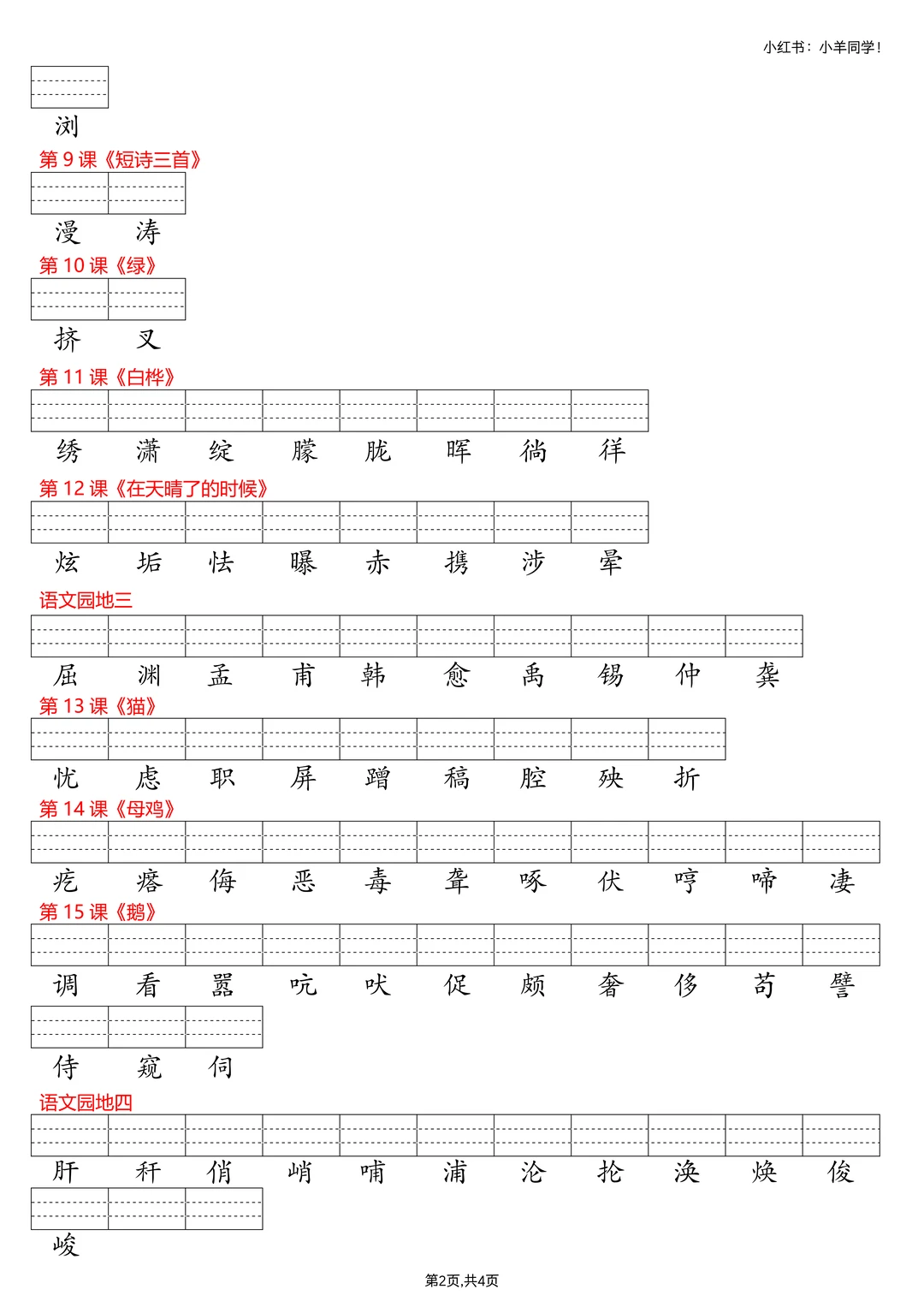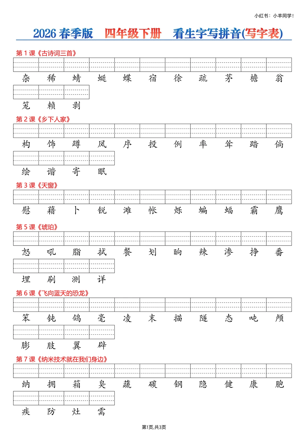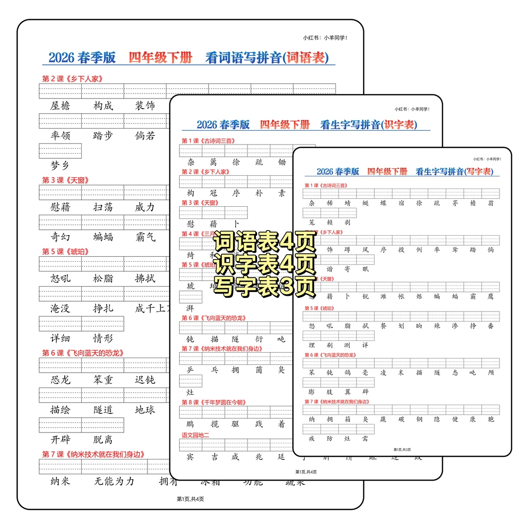 👀 拼音基础弱的娃看过来~ ❌ 不少孩子到五六年级还分不清 b/d、in/ing 💯 字词拼音题千万别失分呀! ✨ 这份课后三表(识字表 + 写字表 + 词语表) ✅ 看生字写拼音专项练习,强化基础超实用~ 💪 拼音稳稳的,语文起步更轻松! ⚠️原创整理,禁止转载发布网络平台或商用