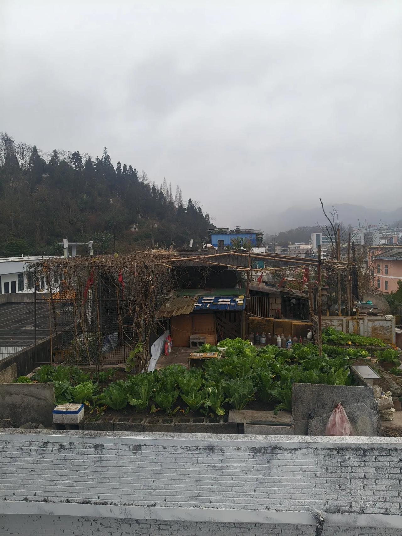 这是某户人家在楼顶开辟的空中菜园子,大概五六个平米,种了挺多的白菜。如果是边吃边种的话,一家人吃,全年无需买白菜。   可不要小看这个小小的菜园子,麻雀虽小,却也五脏俱全。菜园子朝北的一面,种了一棵花椒树,朝南的一面则种了些葱蒜之类的佐料。菜园子四周还用棍子搭起了豆角架,还有一架小小的瓜棚。   自己种自己吃,不用到菜市场跟人家讨价还价,吃了还放心。   抛开省不省钱不说,关键是方便。现割现吃,天天都能吃新鲜蔬菜。   在楼顶上开辟这样一个小小的菜园子,自给自足,闲暇之余,去浇浇水,给蔬菜们呵护呵护,怡情、养生、养性。