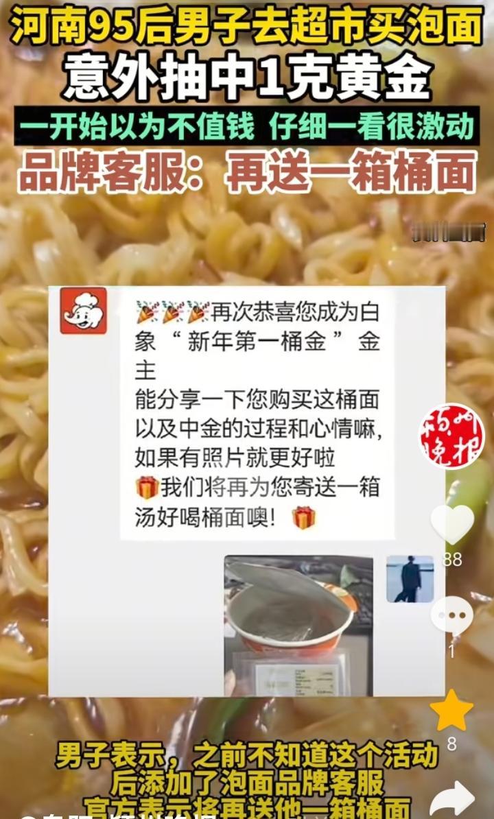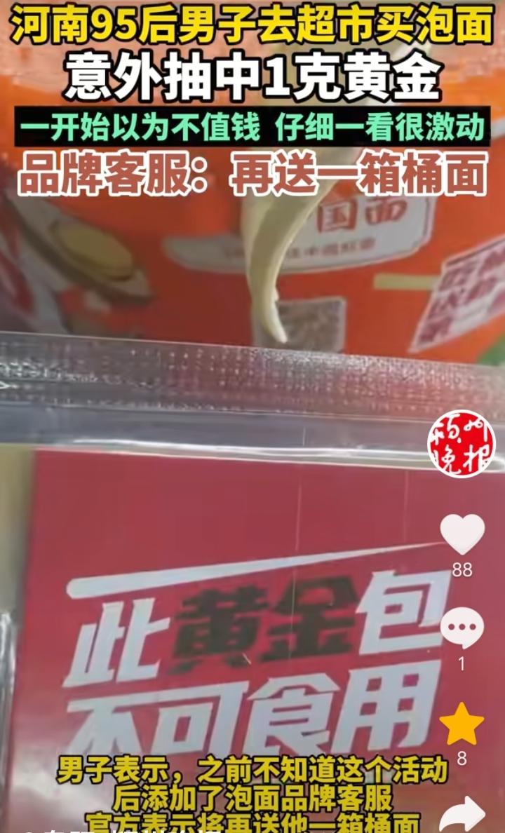“意外的惊喜”!河南,95后男子去便利店随便买了一桶白象泡面,打开后发现“料包”里面含有1克黄条,男子当时很震惊,以为是那种0.001克金箔纸,仔细一看是一克的金条。 男子表示,当时不知道方便面有这个“新年第一桶”活动,后来添加了泡面品牌客服,官方表示在送自己一箱桶面。 真是意外的惊喜,本想买一桶泡面填饱肚子,结果没有想到抽中了一克金条,惊喜来的也是太突然了。 真是世事无常,可能知道有这活动的人会专门去买,就想买到有黄金的那桶,这样反而还买不到,男子不知道结果随便买就抽中了,真是运气来了挡都挡不住。 黄金价格大涨,现在一克就是一千多元,表面看是男子赚了,品牌方赔了,实则这对于品牌方来说才是赚麻了,无形中打了一波广告,这是一个双赢的局面。