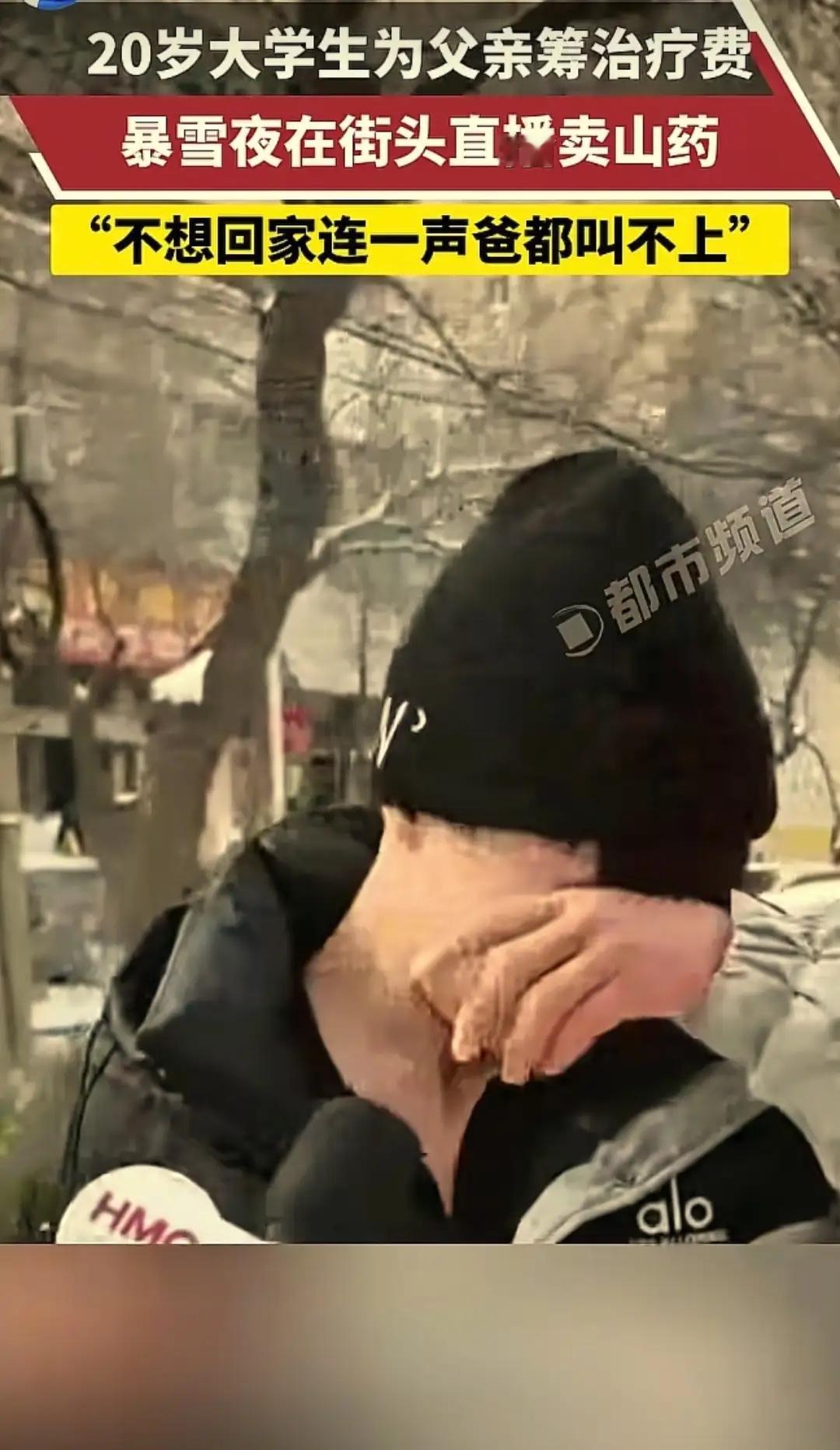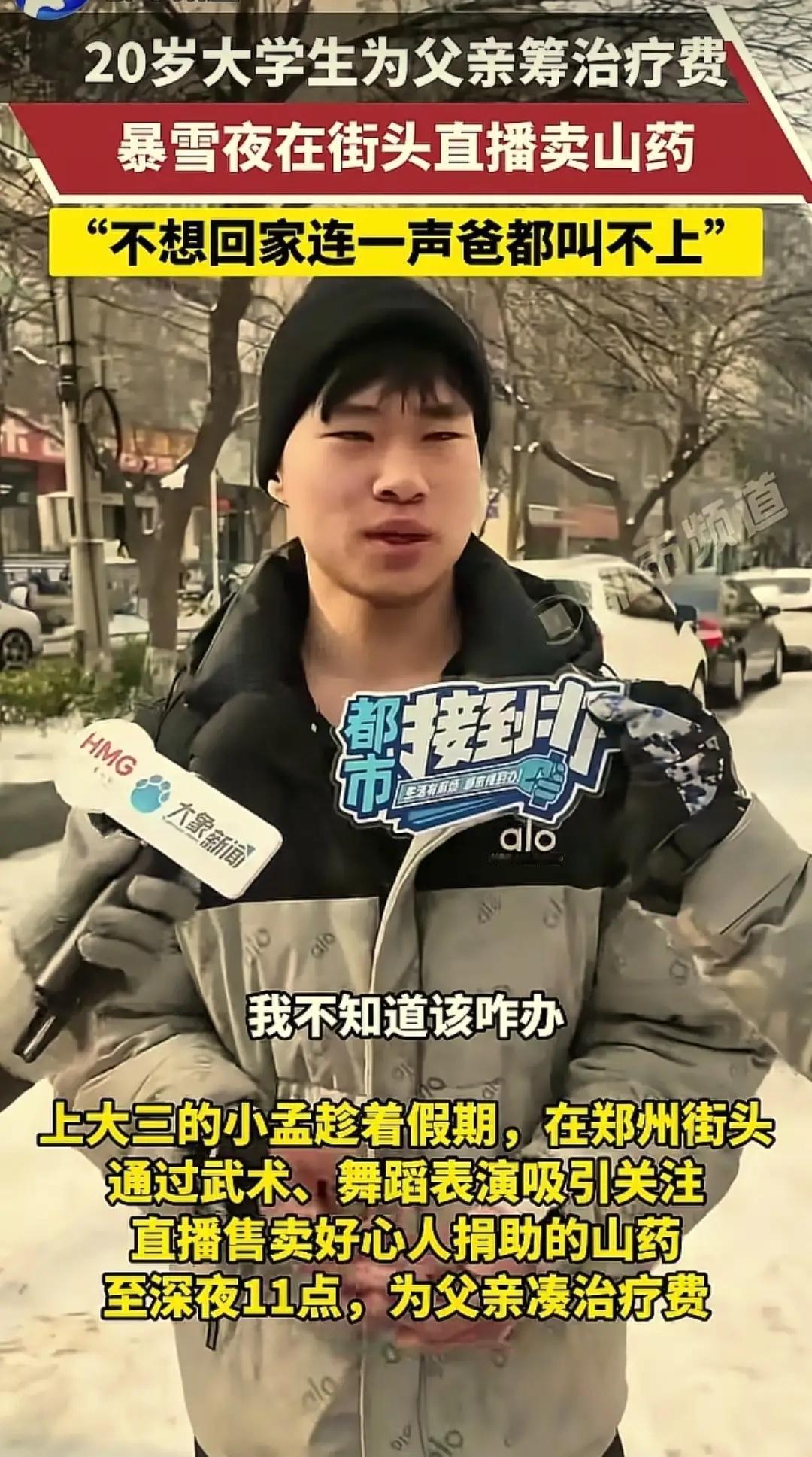 “太心酸了!”河南郑州,一20岁男生,大雪夜直播卖山药,冻得直搓手,本以为是作秀博流量的,结果男生却强颜欢笑说:“父亲得了重病想筹款,家里还有个上初三的弟弟。”网友问起母亲,坚强的男生却一下子哽咽了。 这个在雪夜里坚持直播的男生叫小孟,今年20岁,还是一名大三学生。对他而言,这个冬天格外寒冷。就在四个多月前,他刚刚经历了失去母亲的痛苦。 小孟的母亲在2024年11月被诊断出宫颈癌晚期,为了治病,家里花光了全部积蓄,还欠下债务。尽管小孟曾通过街头卖艺、摆摊卖山药为母亲筹款,母亲仍在2025年7月因并发症不幸离世。 命运没有给这个家庭喘息的机会,母亲去世后不久,小孟的父亲在2025年12月被确诊为胆管恶性肿瘤,手术后出现并发症,住进了ICU,每天治疗费用高达八九千元。面对后续约四十多万元的医疗费,这个早已掏空的家无力承担。 作为长子,小孟毅然扛起了重担。他再次走上郑州街头,在寒风中直播卖山药,每天从晚上7点忙到深夜12点,通过表演武术、跳舞来吸引关注,只为多卖一些山药,多筹一点父亲的救命钱。有时看到网友暖心的鼓励,这个坚强的小伙子会忍不住在直播中落泪。 之前帮助过小孟的好心人,这次捐出了5万斤山药让他售卖,还有商家提供免费仓库给他储存货物。亲戚们也没有催促还款,反而帮忙照顾正在读初三的弟弟。有饭店老板送来一千元钱,并告诉小孟饿了可以去店里吃饭;还有爱心人士表示会负责小孟父亲出院后的看护。 小孟的故事不仅是一个家庭的艰难求生,更展现了亲情的重量和社会的温度。他曾说:“妈妈已经不在了,我不想再失去爸爸,不想回家连一声爸妈都叫不上。” 这句朴素的话,道出了他所有坚持的原因。 各位读者你们怎么看?欢迎在评论区讨论。