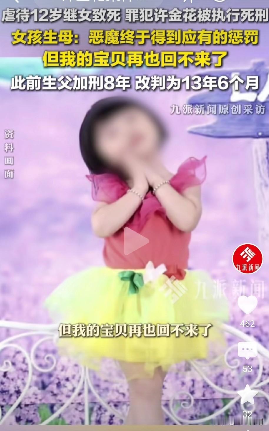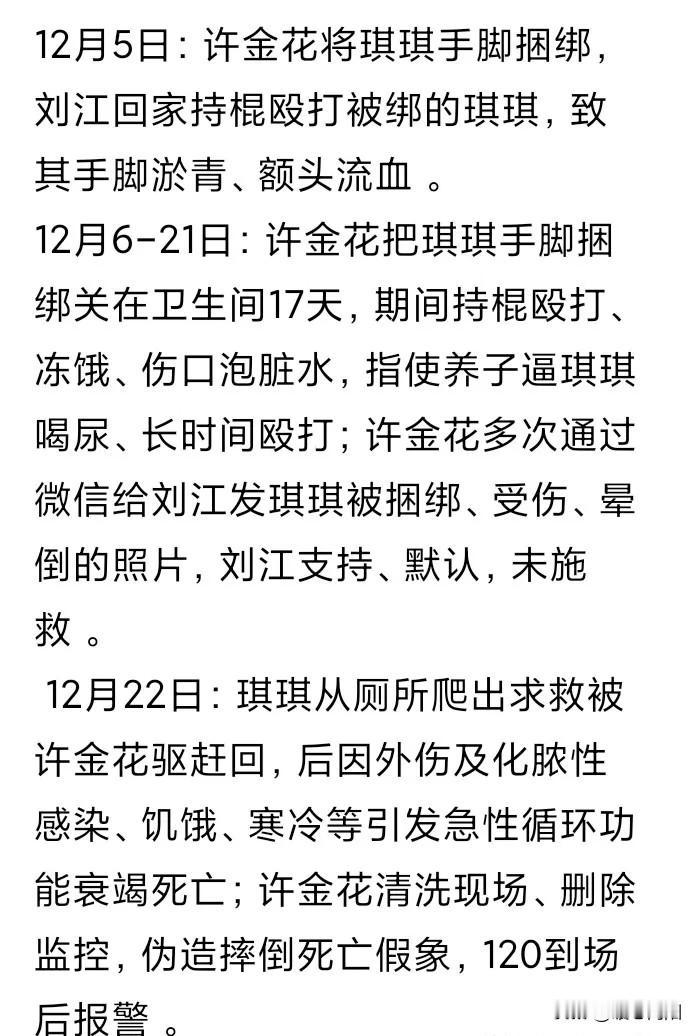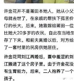 许金花死了,刘江坐牢了!她收养的三个孩子谁来抚养? 1月20日莆田中院依法对许金花执行死刑!丈夫刘江被判13年6个月。 许金花从小父母双亡,跟随舅舅舅妈一起生活,过着寄人篱下的生活。13岁就自己独立生活,吃了上顿,没下顿,生活艰难。 后来经人介绍嫁了一个老男人,由于自己不能生育,领养了两个孩子。因为两个人性格不合离婚了。离婚时前夫把房子留给她,她独自抚养两个孩子,生活艰难。 一边打工,一边照顾孩子。后来在打工时遇见刘江,刘江也是离异,二个就组建了家庭。一穷二白的刘江带着女儿琪琪住进了许金花的家。 许金花以前收养了两个孩,刘江又带的一个孩子,己经是三个孩子,可是许金花和刘江结婚以后,又收养了一个孩子。 你说她不爱孩子,她收养了三个孩子,也不嫌抚养孩子又辛苦又累。说她爱孩子,她对刘江的女儿琪琪又打又骂,并且捆绑住丢在厕所17天,不给吃饭,不给喝水,又冻又饿,还逼着叫喝泻药。最终把琪琪折磨死了! 许金花的恶毒不是一般恶毒,简直没有人性。或许跟童年时缺失爱有关,性格扭曲,和正常人不一样。 现在她死了,她收养的三个孩子谁来抚养,不管谁来抚养,一定要让孩子在温暖有爱的环境中成长,以免心灵上受到伤害,造成性格扭曲。